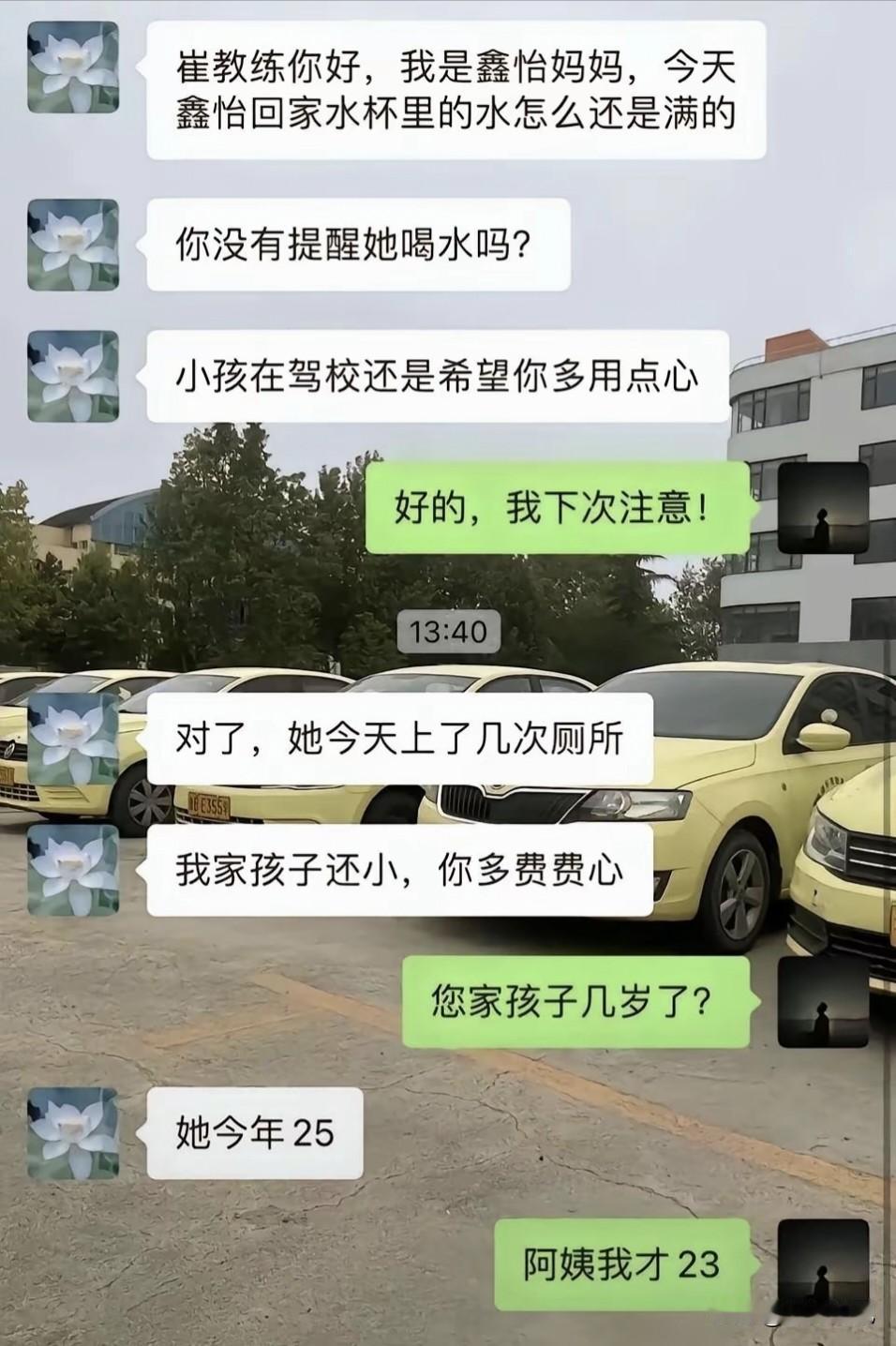 驾校教练遇上奇葩家长,真是小刀剌屁股——开了眼了!学员鑫怡妈妈追着崔教练问女儿水杯没喝水的事,还要求多上心,教练只能点头管,结果大妈又追问闺女上厕所次数,口口声声说“孩子还小,教练要多照顾”。 教练心里估计打了个问号,忍不住问孩子年龄,得知25岁时,直接蚌埠住了,甩出一句“阿姨我才23”。这也让网友笑喷:25岁的巨婴,23岁的教练要当“临时妈妈”,这操作真是青蛙跳悬崖——硬装蝙蝠侠。 这真是—— 教练遇奇葩宝妈, 追问喝水如厕事。 张口就说孩子小, 一问年龄二十五。 教练也才二十三, 反被要求多照看。 网友看了笑翻天, 巨婴养成太离谱。