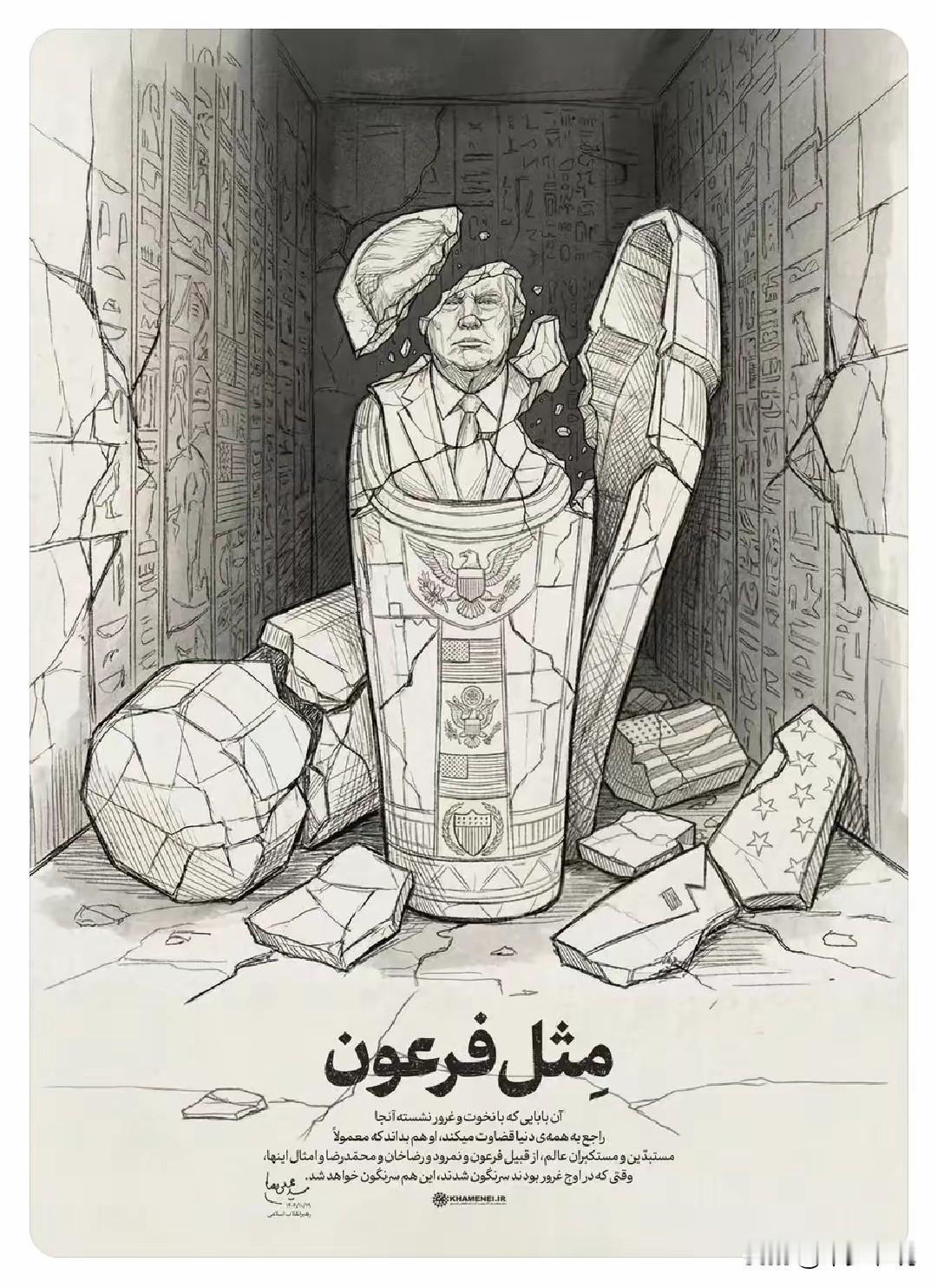 哈梅内伊把特朗图“塑造”成法老并打碎 昨天哈梅内伊通过社交媒体发文称“世界上那些暴君和傲慢的人,如法老、宁录礼萨汗、穆罕默德·礼萨等等,通常都在最傲慢的时候被推翻”同时配图为特朗普头像的法老木乃伊,并被打碎。 而特朗普“法老”图像中破碎的还有美国国旗,以及中情局等机构的Logo,从此图来看哈梅内伊是准备与美国对抗到底,但是以伊朗现在的形势,根本不足以与美国对抗。