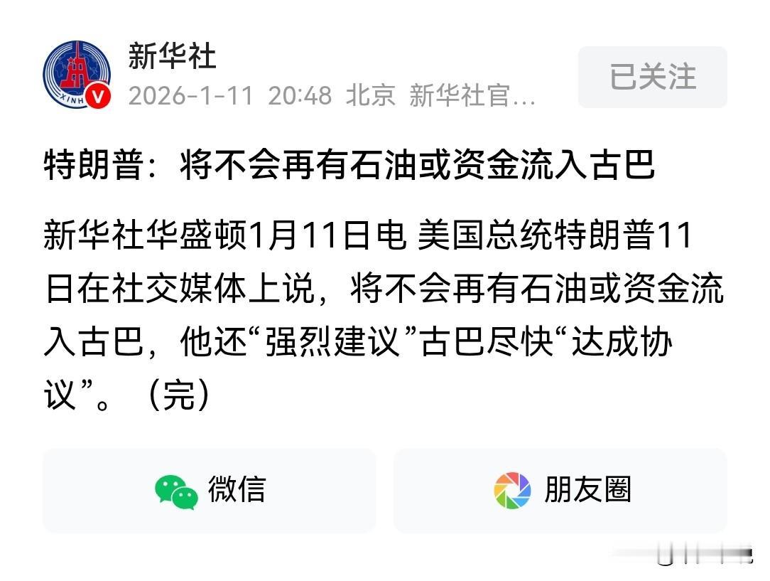 古巴没了委内瑞拉的石油只能依靠中国 昨天特朗普在社交平台上宣布“将不会再有石油或资金流入古巴”,古巴的能源供应一直以来都是依靠委内瑞拉,但是一旦美国开始全面入侵委内瑞拉,那么古巴的石油供应肯定会受到影响。 而没有了委内瑞拉的石油,古巴能依靠的只有中国,因为中国拥有完善的新能源供应体系,如果古巴引入中国的光伏及风电等能源体系,进行日常的生活能源供应完全没有问题。