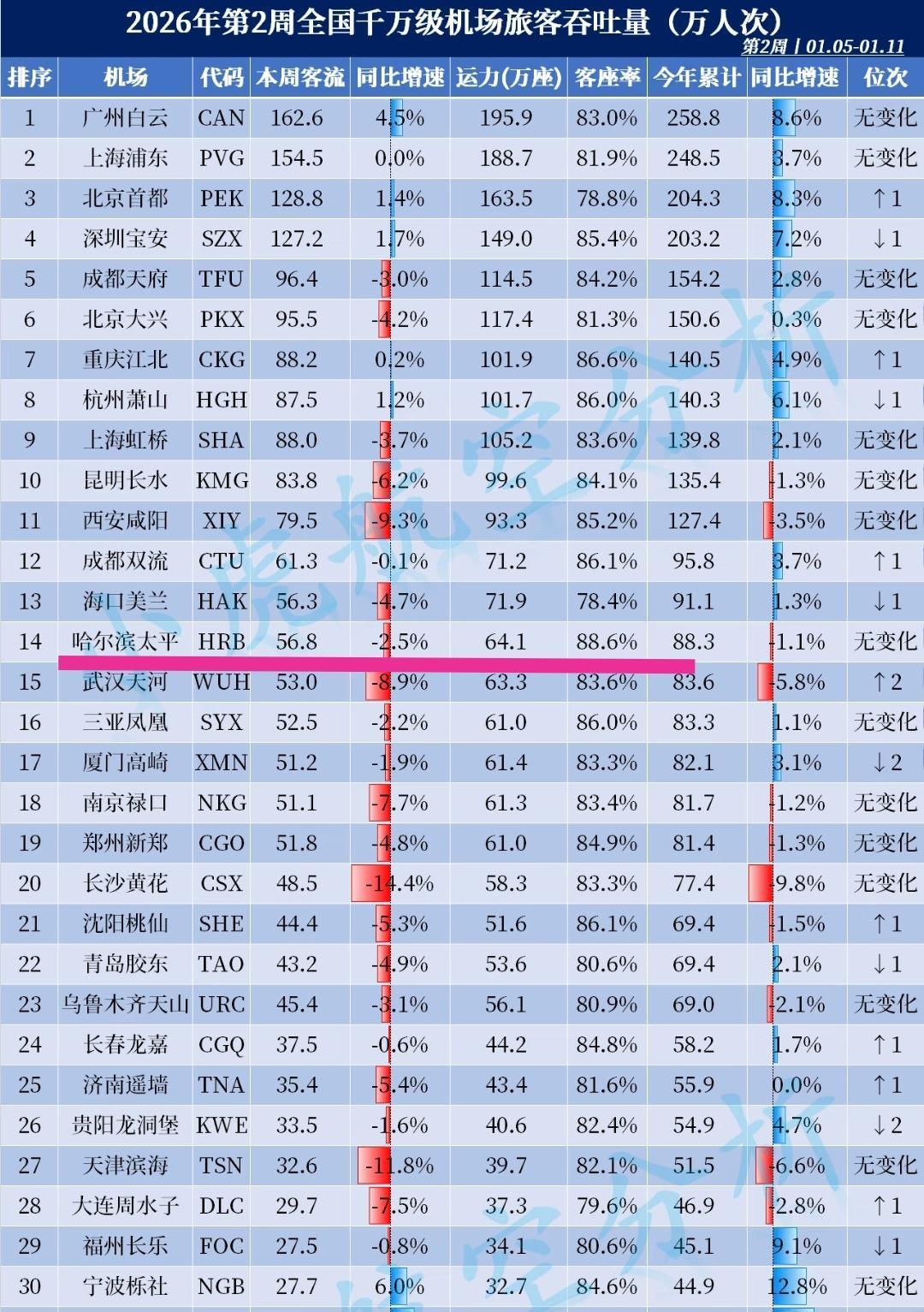 在2026年第二周哈尔滨机场客流量高于武汉、南京、长沙等新一线城市。从这个细节可以看出哈尔滨的冰雪旅游发展越来越成熟,即便有很多南方小土豆陆续抵达也能做到秩序井然。 相比于2024年的受宠若惊,2025年的渐入佳境,实际上2026年哈尔滨已经完全适应季节性一线热门旅游城市的发展定位。 如果今后哈尔滨地铁9号线能修好的话,外地游客从机场下来后到市里会更方便。届时哈尔滨机场客流量很有机会超过海口,让我们敬请期待。