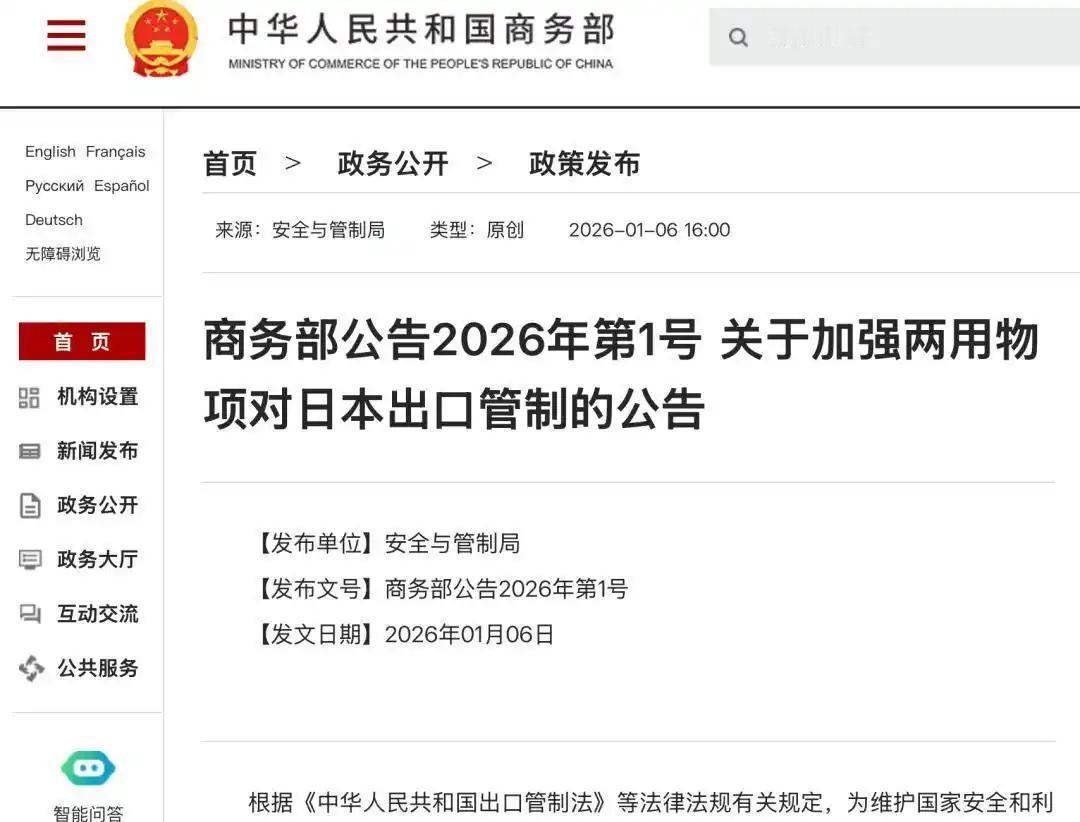 我方加码制裁日本后,各国罕见沉默! 因为这次是玩真的,就这么简单。平时大家互骂当然有人支持了,现在动刀子了,自然没人敢掺和进去。 2026年1月6日商务部发布的公告,看似只是一份出口管制文件,实则构建了全方位的管控网络,明确禁止所有两用物项对日本军事用户出口,禁止用于军事用途及任何提升日本军事实力的相关用途,这种禁令覆盖的范围远比表面看起来更广泛。 所谓两用物项,就是那些既能服务于民用生产生活,又能直接支撑军事装备研发、生产和性能提升的货物、技术与服务,小到特种材料、电子元件,大到精密设备、技术资料,都是现代军工体系不可或缺的基础。 从制造战机、导弹所需的碳纤维、高强度铝合金,到雷达、制导系统依赖的高性能芯片、高精度传感器,再到核反应堆、无人机等关键装备的核心部件,都在此次管控范围内,这些物项恰恰是日本军工产业的薄弱环节,其对外部供应的依赖度远超外界想象。 日本虽然在民用高科技领域表现突出,但军工体系存在致命的结构性依赖,尤其是在关键战略材料和核心部件上,对中国的供给形成了难以摆脱的依赖链条。 日本的重稀土几乎100%依赖中国,而重稀土是制造导弹制导陀螺仪、驱逐舰相控阵雷达、潜艇低噪音推进电机的核心材料,没有这些材料,日本先进武器装备的生产和升级就无从谈起。 用于军工芯片与雷达的镓、锗,日本对华依赖度分别超过85%和接近100%,这些稀有金属的提纯技术长期被中国掌握,日本本土不仅产能极低,短期内也无法突破技术瓶颈建立替代产能。 即便是光刻机关键材料超高纯氟化氢,尼康、佳能等日本企业70%的供应都来自中国,短期寻求韩国、欧洲替代不仅面临产能不足的问题,还会导致成本大幅上涨,根本无法满足军工生产的稳定需求。 更关键的是,日本军工采用“寓军于民”的生产模式,大量民用领域的材料、技术会间接流入军事生产,这种模式看似灵活,却恰恰成为此次管控的精准靶点。日本2025年《装备技术白皮书》就曾承认,90%以上的军用级砷化镓晶圆依赖中国进口,而这种材料既是民用电子产业的重要部件,也是提升雷达和电子战系统性能的关键。 此次我方的管控措施精准区分了民用与军事用途,明确锁定军事用户和军事相关应用场景,既避免了对正常贸易的不必要影响,又彻底切断了两用物项向日本军工体系流动的渠道,这种精准度让日本难以找到规避空间,也让其他国家无法以“影响正常贸易”为由提出反对。 各国之所以选择沉默,本质上是看清了此次制裁的合法性、合理性与有效性,没有国家愿意为了日本的军事利益而损害自身权益。 从国际规则来看,出口管制早已成为各国维护国家安全、防止敏感物项扩散的常规手段,欧盟、美国、日本等都有完善的两用物项管制体系,我方此次措施完全符合国际通行惯例,不存在任何违规之处,其他国家没有立场从规则层面进行指责。 从利益角度出发,此次管控仅针对日本军事相关用途,并未波及其他国家与日本的正常民用贸易,各国的经济利益没有受到影响,自然不会轻易表态介入。 同时,日本近年来不断突破“专守防卫”原则,积极发展“反击能力”,其军事扩张动向本就引起周边国家和部分西方国家的警惕,我方的管控措施在客观上遏制了地区军事力量失衡的风险,符合多数国家维护地区稳定的潜在诉求。 此外,各国都清楚中国在全球两用物项供应链中的主导地位,中国占据全球90%以上的镓产量、68%的锗产量和92%的稀土精炼产能,这种产业优势意味着任何国家都无法轻易替代中国的供应角色,与中国对抗或指责中国的管控措施,最终可能损害自身在相关产业链中的利益。 对于其他国家而言,介入此事不仅没有实际收益,反而可能面临多重风险。如果公开支持日本,就意味着站到了维护地区稳定的对立面,还可能引发与中国的贸易摩擦,影响自身在华利益;如果公开反对日本,又会违背其与日本的盟友关系或双边合作框架。 在这种两难境地中,保持沉默成为最稳妥的选择,既不会得罪任何一方,也不会让自身陷入被动。而这种沉默,恰恰印证了我方此次管控措施的精准有效,也让国际社会清晰认识到,任何危害地区安全、挑战我方核心利益的行为,都必将付出应有的代价,我方有能力、有决心通过合法合规的手段,捍卫自身安全与地区和平稳定。