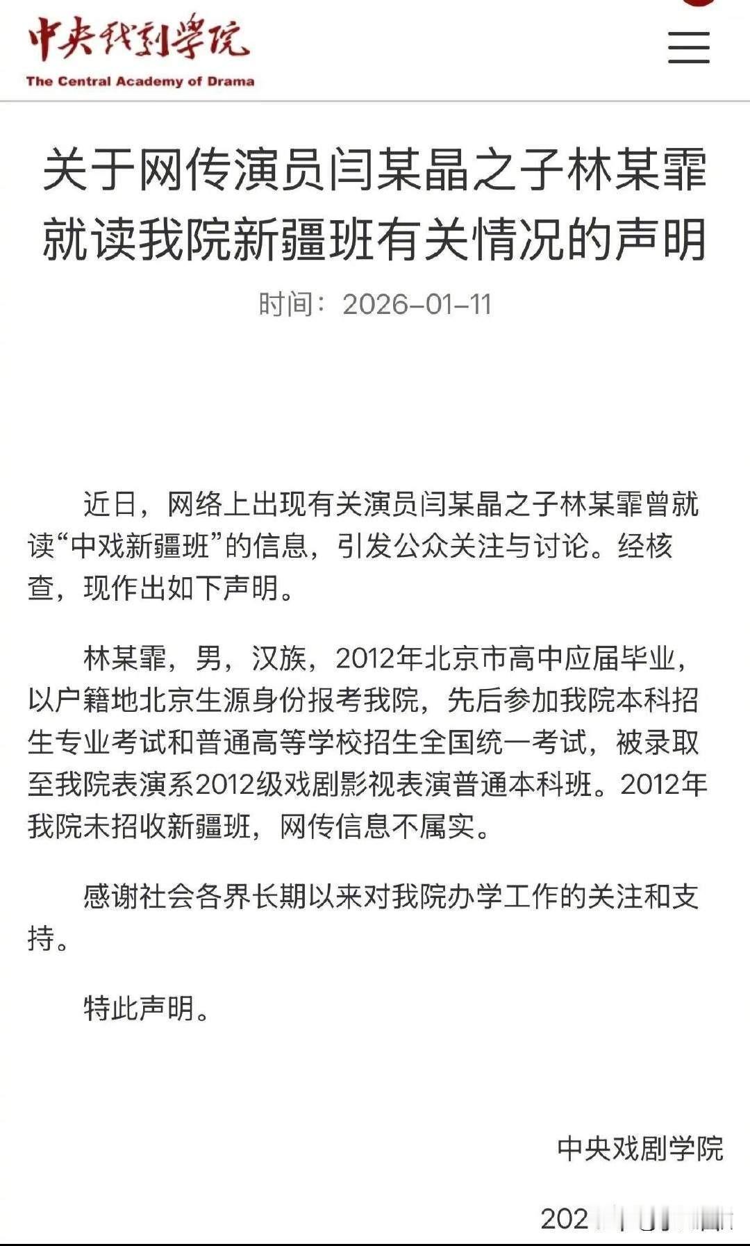 这是把中戏放在火上烤啊, 闫某晶在直播间里透露自己儿子是通过新疆班考上的中戏,但是根据报考条件所必须的三统一,林某霏可以说是一项都不符合,如果闫某晶所说的为事实,那么就说明中戏的管理出了问题。 这也就不难理解,中戏对于此事的回复是,2012届根本就没有新疆班,也就是对于闫某晶所说的给了否认,承认了这事就更大了。