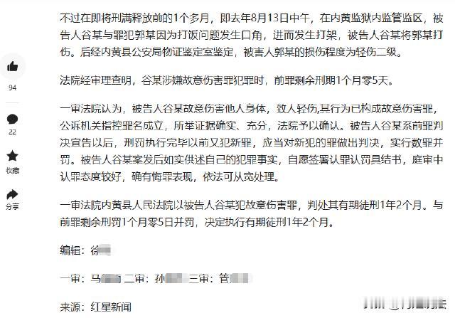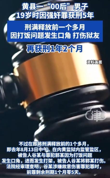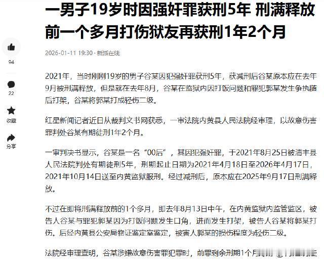 河南安阳,内黄县。00后的谷某,在19岁时犯强 奸 罪,被判5年,送到内黄监狱服刑。后减刑本应在去年9月刑满被释放,去年8月时,他在监狱和狱友因打饭起争执,把狱友打成轻伤二级,又获刑1年2个月。 (来源:裁判文书网、红星新闻、新派在线) 2026年1月11日,新派在线报道了这则让人唏嘘的事。 据报道,2021年时,00后的谷某才19岁,他在这一年却犯下了强 奸 罪。 经法院审理后,被判了有期徒刑5年。 刑期从2021年4月18日开始,到2026年4月17日结束。 2021年10月14日,谷某被送到了内黄监狱服刑。 在监狱里,谷某开始和其他犯人一样,每天按部就班地生活,他也盼着能早点出去,重新开始新生活。 后来,谷某因为表现还算可以,获得了减刑。 按照减刑后的结果,他本应该在2025年9月17日刑满释放。 可谁能想到,意外就在这时候发生了。 去年8月13日中午,在内黄监狱的监管监区,正是犯人们打饭的时间。 谷某去排队打饭时,罪犯郭某也过来了,不知道是因为人多拥挤,还是别的什么原因,两人因为打饭的问题吵了起来。 一开始,只是言语上的争执,谷某年轻气盛,脾气一下子就上来了,他觉得郭某就是在故意找茬。 郭某也不甘示弱,继续和谷某对骂。 两人的情绪越来越激动,争吵声也越来越大。 突然,谷某再也忍不住了,他握紧拳头,朝着郭某就打了过去,郭某没想到谷某会动手,一下子没反应过来,被谷某打中了脸部。 郭某也不示弱,立刻还手。 两人就这样扭打在一起,周围的人赶紧上前拉架,可两人打得正凶,一时半会还拉不开。 在打斗过程中,谷某下手越来越重,郭某渐渐有些招架不住。 最终,郭某被打倒在地,脸上、身上都有不同程度的受伤。 监狱的工作人员听到动静后,迅速赶了过来,将两人分开。 随后,郭某被送到了监狱的医务室进行检查。 经过鉴定,郭某的损伤程度为轻伤二级。 这意味着,谷某的行为已经构成了犯罪。 谷某打伤狱友的行为,依据《刑法》第二百三十四条,故意伤害他人身体的,处三年以下有期徒刑、拘役或者管制。 谷某主观上有伤害狱友郭某的故意,客观上实施了动手打架的行为,且经鉴定郭某损伤程度为轻伤二级,这完全符合故意伤害罪的范畴。 谷某故意伤害他人的行为,会受到什么样的处罚呢? 按照上述法条,谷某可能面临三年以下有期徒刑、拘役或者管制的处罚。 但这里有个特殊情况,谷某是在前罪强奸罪的刑罚执行期间,又犯新罪故意伤害罪。 根据《刑法》第七十一条,判决宣告以后,刑罚执行完毕以前,被判刑的犯罪分子又犯罪的,应当对新犯的罪作出判决,把前罪没有执行的刑罚和后罪所判处的刑罚,依照本法第六十九条的规定,决定执行的刑罚。这就是数罪并罚原则。 经审理,法院认为,谷某故意伤害他人身体,致人轻伤,其行为已构成故意伤害罪。 而且,谷某是在前罪刑罚执行完毕以前又犯新罪,应当对新犯的罪作出判决,把前罪没有执行的刑罚和后罪所判处的刑罚,依照规定决定执行的刑罚。 不过,考虑到谷某在案发后如实供述了自己的罪行,认罪认罚,态度较好,有悔罪表现,法院决定对他从宽处理。 最终,法院以故意伤害罪判处谷某有期徒刑1年2个月,与前罪剩余刑罚并罚,决定执行有期徒刑1年2个月。 谷某原本以为自己马上就能出去了,可没想到又因为自己的冲动,再次增加了1年2个月的刑期。 谷某太冲动了,本来都快出去了,现在又把自己搭进去了。 谷某的家人得知后,也是痛心疾首。他们原本盼着谷某能早日回家,重新做人,可现在又要多等怎么久了。 您对谷某在监狱里再次犯罪,有什么看法呢?