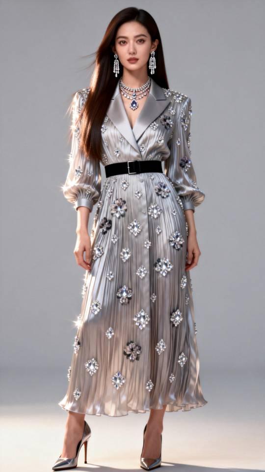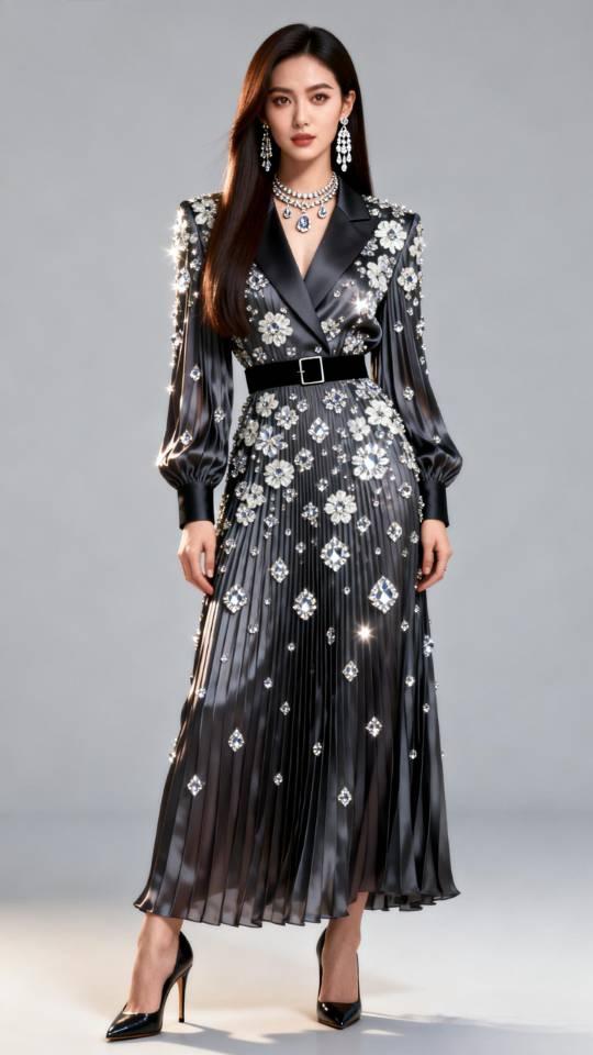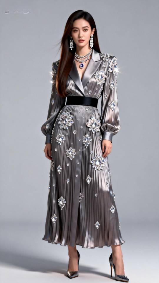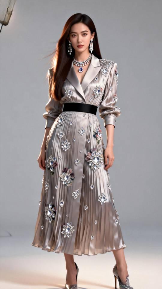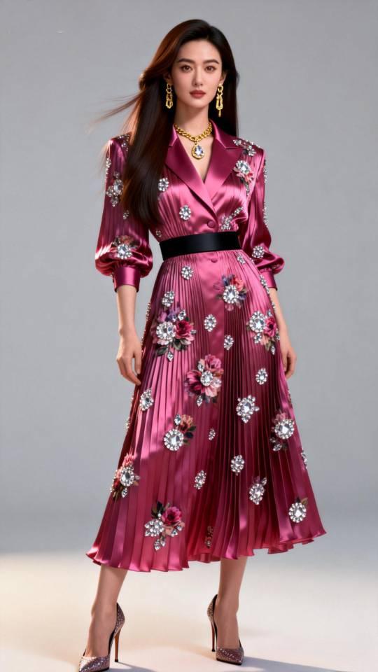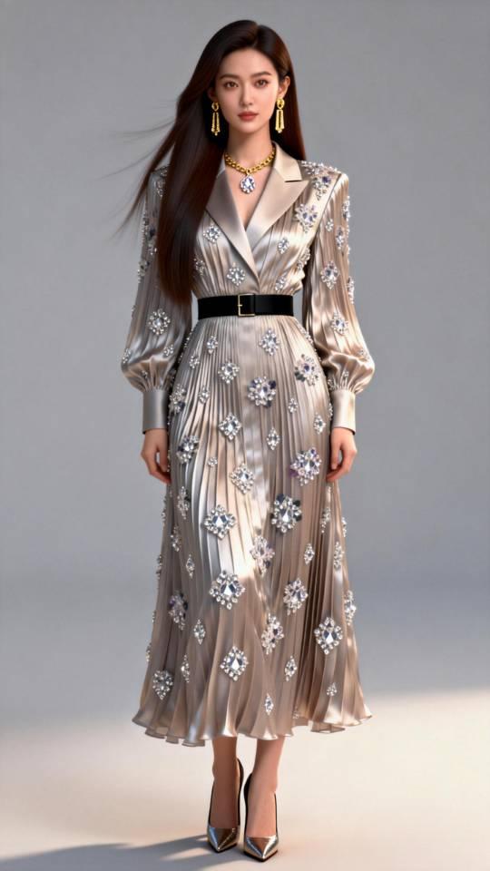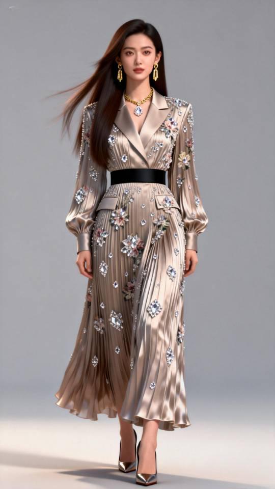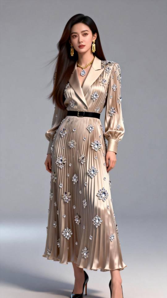 女子展示多款褶皱真丝连衣长裙。连衣裙真丝褶裙