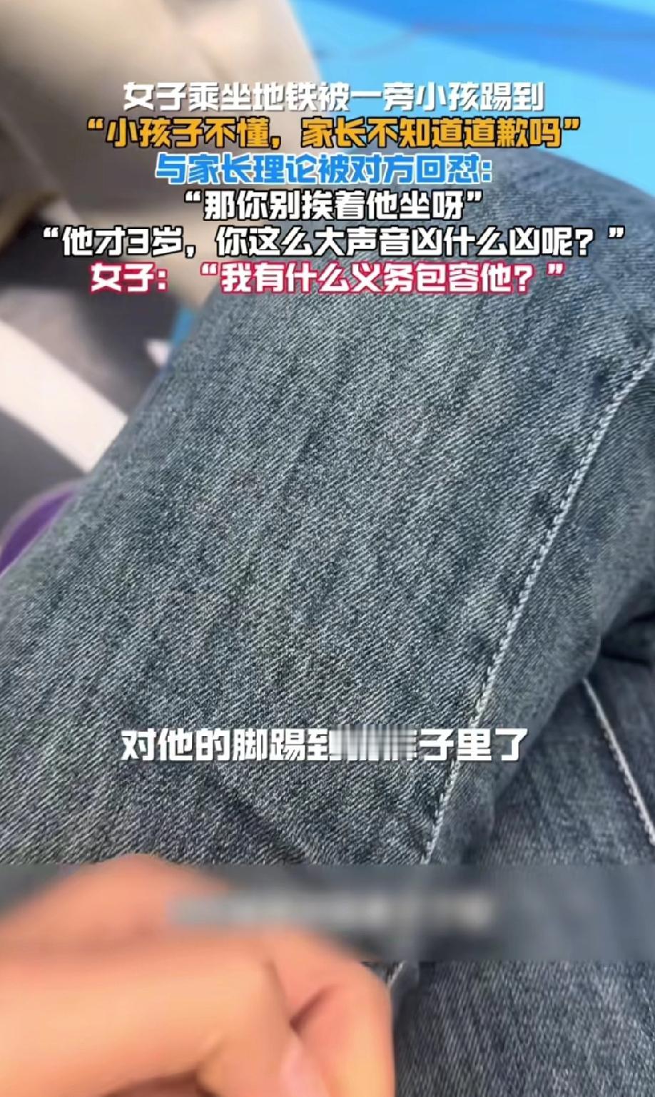 长沙地铁上,女子发视频称:被邻座小孩踢到了裤子,家长不仅不道歉还强词夺理,还非常嚣张的怼她…… 视频显示:据小男孩母亲说,这个小男孩今年才三岁多,那个被踢到裤子的女生,也是发视频的女生回怼道“是他踢到了我,他是你的崽又不是我的崽,我凭什么包容他”…… 评论区网友表示: 如果我是孩子家长,我会说声抱歉。如果我被孩子踢到了,我觉得也没啥! 这位网友说的一点没错,在公共场合,为这么一点小事都会吵起来,只能说明两个女的都不是善茬,但凡有一个态度好一点,都不会让这种事情发生。 这个女的还好意思把这种视频发布到网上,真的是让人无语!!!