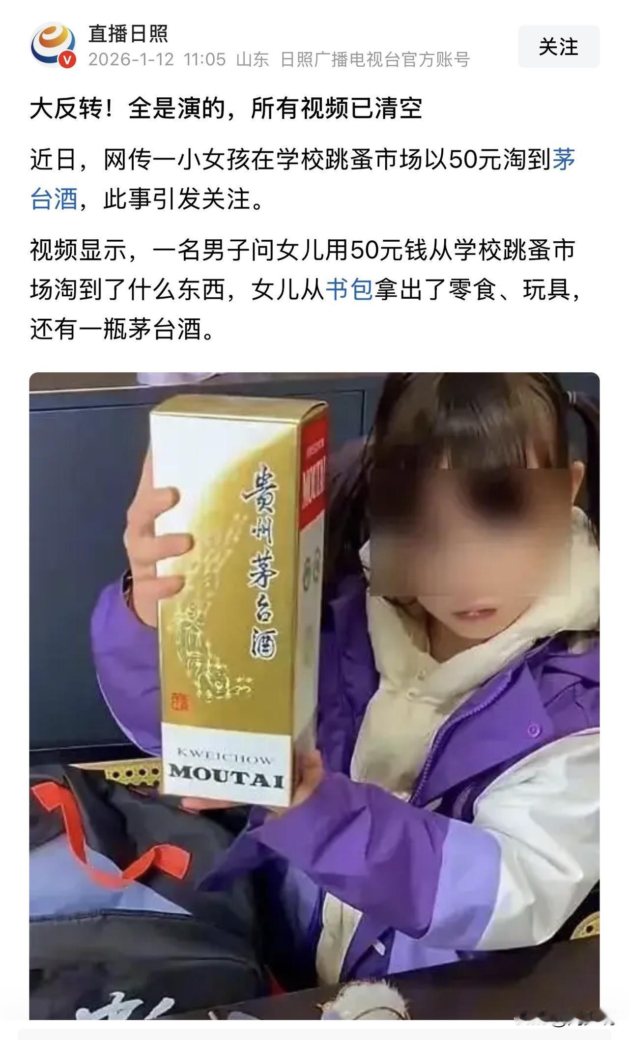 “太离谱了!”近日,一段网传一小女孩在学校跳蚤市场以50元淘到茅台酒,此事引发全网关注。没想到相关部门调查之后,竟然大反转,相关视频为虚假内容,系杜撰的段子! 此事曝光后,网友吐槽声一片:“为了流量毫无底线,段子好歹标清楚啊。而且拿学校和孩子编故事,太没分寸了!” 在流量至上的时代,周少觉得这类博眼球的杜撰内容真该刹刹车了,真没有想到现在有些人竟然把魔爪伸手到孩子身上,属实让人痛斥! 学校跳蚤市场本是培养孩子财商、锻炼社交的好平台,却被当成吸睛工具肆意消费,不仅误导公众认知,更可能给孩子传递“弄虚作假能获利”的不良导向。 最后,周少觉得平台也需加强内容审核,创作者更该守住底线,别让流量吞噬了良知。这类博流量的视频,早该扼杀了……#寻美三湘# #长沙新朋友#