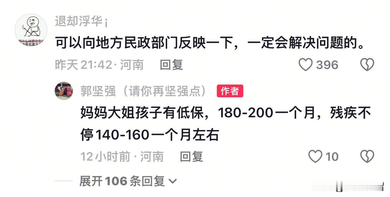 这女孩的遭遇,简直就是现实版《活着》里的福贵啊! 刷抖音时,看到一个叫郭坚强(大概是她给自己取的名字)的女孩,她独自照顾家庭已有16年。 16年前,年仅17岁的她,家里遭遇了一场变故。那天,妈妈和姐姐出门办事,不幸遭遇车祸。姐姐成了植物人,妈妈瘫痪在床。 不久后,爸爸因过度伤心,加上长期辛苦劳作,引发脑出血,也瘫痪了。 后来,她结婚生子,可女儿却患上了罕见病。 虽说一家人都有低保,但她常年无休地照顾四位家人,实在是太不容易了。 希望当地相关部门能多关照这一家人,让她能衣食无忧,更有精力照料四个残疾亲人。郭坚强,愿你能一直坚强下去。 (资料图片来源网络)