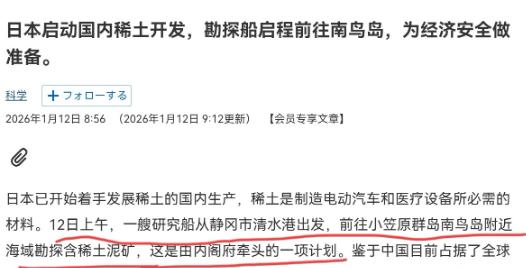 日本态度已明,日本国内有动作了! 麻烦看官老爷们右上角点击一下“关注”,既方便您进行讨论和分享,又能给您带来不一样的参与感,感谢您的支持!   1月12日,根据日经新闻报道,就在高市早苗公开表示中国的行为不可接受,管制行为只针对日本之后,日本国内已经有动作了。日媒称,12日上午,一艘日本研究船从静冈市清水港出发,前往小笠原群岛南鸟岛附近海域勘探含稀土泥矿。   这艘船的启航,绝不仅仅是一次简单的海洋资源勘探,它背后所承载的,是日本内阁府直接主导的国家级战略部署。这种几乎没有任何延迟的反应,揭示了其背后早已准备好的应对方案。   可以说,高市早苗在政治层面的表态刚刚结束,物理层面的行动就已经在码头上展开,这艘船的航向,直接指向了日本试图摆脱对外部关键资源依赖的决心。   日本选择的目标地点——小笠原群岛南鸟岛附近的海域,本身就说明了这次行动的特殊性,他们要找的不是传统陆地矿藏,而是深藏于数千米海底的稀土泥。   考虑到目前全球稀土生产的绝大部分份额都集中在中国手中,日本此举的意图再明显不过,那就是要在自己的控制范围内,开辟一条全新的、不受外部因素干扰的稀土供应链。   这艘研究船的任务,就是去探明这条新路线的可行性,看看深海里的泥土,是否真的能支撑起日本高科技产业的未来。   通过这次果断的出航,日本向外界传递了一个清晰到不能再清晰的信号:在稀土这个关乎国家工业命脉的领域,日本已经不准备再看任何人的脸色。   他们已经下定决心,要从根本上切断对中国供应链的依赖。这种做法,既是对外部压力的直接回应,也展现了日本国内在面对供应链风险时,早已制定了详细的计划,他们试图用这种方式宣告,日本的立场不会因为经济上的威胁而动摇。   然而,决心虽然坚定,但现实的挑战却更为严峻。摆在日本面前最核心的问题是,从勘探到实现工业化生产,这条路究竟要走多久?稀土产业的壁垒极高,并不仅仅是挖出来那么简单。   中国能够形成今天的绝对优势,是几十年技术积累、资本投入和完整产业链建设的结果,这套复杂的体系,绝非一朝一夕就能复制。   首先,深海采矿本身就是一个巨大的技术难题,其工程难度和成本都远超陆地开采,即便日本能够克服技术障碍,成功将稀土泥从海底打捞上来,后面更为关键的分离和提炼环节,才是真正的考验。   稀土元素的物理和化学性质极为相似,将其从矿泥中高效、低成本地提纯出来,需要非常成熟的化工技术,如果日本在精炼技术上无法取得突破,或者生产成本居高不下,那么这次深海豪赌的结果很可能得不偿失。   这份独立自主的账单,最终将由日本的制造业来支付,一旦脱离了现有成熟且性价比极高的供应链,转而使用本土生产的高成本稀土,日本的汽车、电子等支柱产业的国际竞争力必然会受到冲击。   这艘驶向南鸟岛的研究船,承载的是日本确保国家战略安全的期望,但它同时也可能开启一个让日本工业付出沉重代价的未来。这场围绕着关键资源的博弈,显然已经进入了深水区。