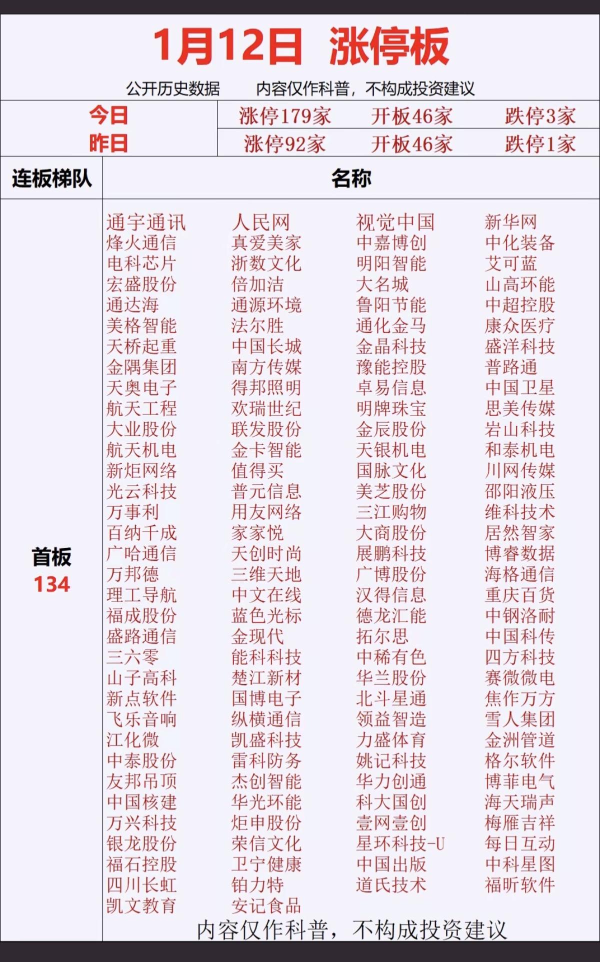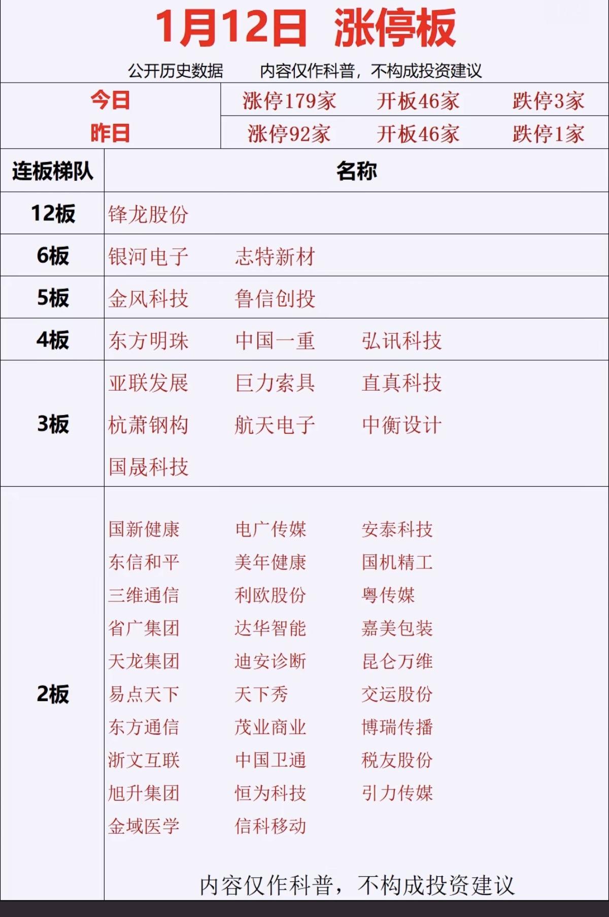 1.12周一 涨停板股票:连板高度! 今日涨停179家 开板46家 跌停3家 昨日涨停92家 开板46家 跌停1家 12连板 锋龙股份 6连板 志特新材 银河电子 5连板 鲁信创投 金风科技