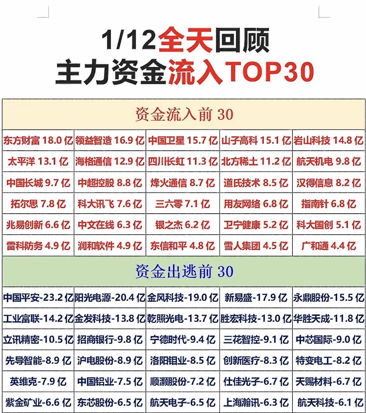 1月12日主力资金情况梳理前30名个股 主力资金流向两极分化:东方财富、领益智造等获大额流入,中国平安、阳光电源等遭大幅抛售,市场分歧明显。 主力资金流入东方财富等领涨,中国平安等出逃明显,市场分化加剧。