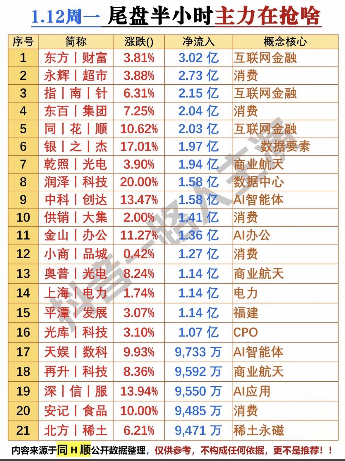 1.12周一尾盘半小时主力抢筹榜,揭秘哪些股票受追捧! 主力抢筹热点:互联网金融、消费、AI、数据中心、商业航天等板块受追捧,资金流入明显