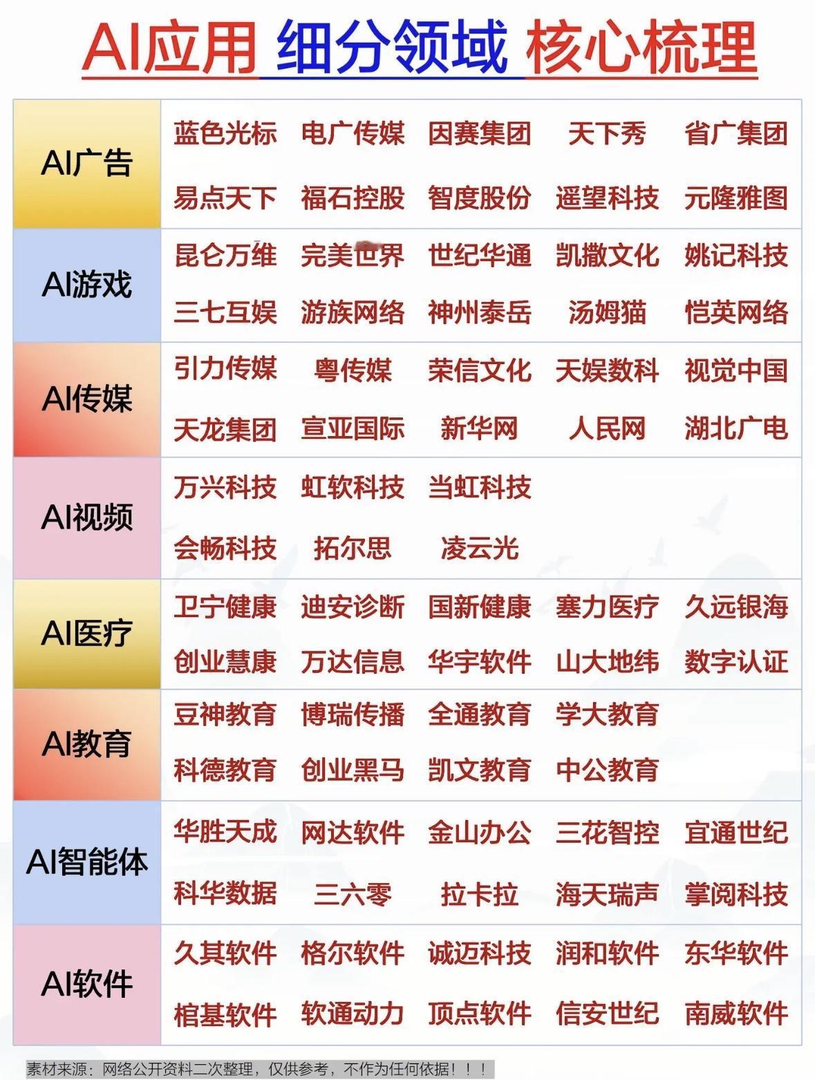 AI应用细分领域核心梳理,带你领略科技前沿!🚀💡 AI赋能多领域:广告、游戏、传媒、医疗、教育及软件行业加速智能化转型,企业争相布局未来赛道。 AI赋能千行百业:广告、游戏、传媒、医疗、教育、视频、软件等领域龙头集结,技术驱动产业升级新浪潮。
