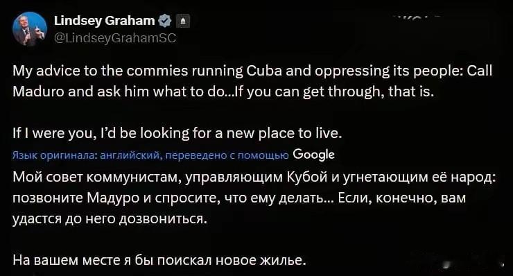 太霸道,美国参议院建议古巴领导人换个地方 美国参议员林赛·格雷厄姆近日通过社交媒体发文称“古巴领导人应该换一个地方住了”同时在文中提到了已经被美国抓捕的委内瑞拉总统马杜罗,这种威胁的意味十分明显,就是要古巴领导人尽快屈服,否则就会步马杜罗的后尘。