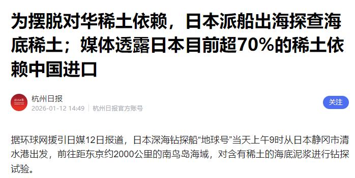 日本态度已明,不会指望中国,日本国内有动作了! 近期中日之间围绕军民两用物资管制的博弈愈演愈烈,就在1月11日高市早苗公然叫板,宣称中方的管制行为只针对日本、令人无法接受之后,日本国内便急不可耐地亮出了所谓的应对举措,这般紧锣密鼓的操作,着实让人看清了其色厉内荏的本质。 根据日经新闻1月12日的报道,当天上午,日本一艘研究船已经从静冈市清水港启程,直奔小笠原群岛南鸟岛附近海域,目的很明确,就是去勘探含稀土的泥矿,显然是想在稀土供应上摆脱对中国的依赖,摆出一副“不再指望中国”的强硬姿态。 但明眼人都能看出,这不过是日本自欺欺人的把戏罢了。有稀土矿和能实现稀土自主供应,完全是两码事,这中间隔着难以逾越的技术和产业鸿沟。 就拿美国来说,境内其实并不缺乏稀土矿资源,可这么多年来,始终没能实现稀土自主,核心就是卡在了提炼和加工环节。日本现在急着去海底勘探稀土,即便真的找到了储量可观的稀土泥矿,后续的开采、提炼等一系列问题,都不是短时间内能解决的。 更关键的是,我们这次对日本实施管制的军民两用物资,可远不止稀土这一种。 1月6日,我国商务部已经明确宣布,禁止所有两用物项向日本军事用户、军事用途,以及一切有助于提升日本军事实力的其他最终用户用途出口,而这份管制清单涵盖的物项超过900种,涉及材料、软件、技术、设备部件等多个领域,覆盖了军工等诸多产业链。 像钨粉这种既能用于民用工业,又能制造穿甲弹芯、航空航天发动机的关键材料,还有制造导弹推进剂的端羟基聚丁二烯聚合物原料等,都是日本军工产业急需的,而这些物资,日本对中国的依赖度都不低。 日本政府自己发布的2024年版《通商白皮书》就曾披露,在1406个商品品类中,日本超过一半的进口额都来自中国,这个依赖程度是美国的2.5倍。 其中,稀土是日本目前最大的软肋,日本超过70%的稀土都依赖从中国进口,尤其是制造先进雷达、战机发动机等高端军工装备必需的重稀土,日本对中国的依赖度甚至高达80%—90%。 此前有数据显示,一旦中国对日本出口的稀土和其他关键矿产供应长期中断,日本的实际GDP可能会下降1.3%至3.2%,就业人数也可能减少90万至216万,这对日本经济的打击将是毁灭性的。 日本这次之所以急着在南鸟岛海域勘探稀土,说白了就是慌了神。高市早苗之前嘴上喊着“不可接受”,还试图拉拢七国集团施压,但实际上西方各国都有自己的麻烦,根本没人愿意为日本出头。 在这种情况下,日本只能硬着头皮搞所谓的“自主勘探”,试图以此打破困局。可日本似乎忘了,他们对中国物资的依赖是结构性的,不是靠一次海底勘探就能改变的。 从产业现实来看,中国在稀土提炼加工领域占据着全球90%以上的产能,拥有成熟的技术和完整的产业链,这是其他国家短期内无法替代的。 日本就算现在开始布局稀土自主,从勘探、开采到建立完整的提炼加工体系,至少需要数年甚至十几年的时间,期间的资金投入和技术攻关难度,都是难以想象的。而在这之前,日本军工产业和高端制造业的发展,都将因为物资短缺而陷入停滞。 说到底,日本现在的这些动作,不过是徒劳的挣扎。中方实施出口管制,完全是因为高市早苗等日本政客公然干涉中国内政、发出武力威胁,中方是为了维护国家安全和利益,依法依规采取的正当措施。 日本与其急着搞这些治标不治本的小动作,不如好好反思自己的错误言行,正视中日关系的基础,只有纠正错误,才能真正化解当前的困局。 否则,继续抱着对抗的心态,最终只会让自己陷入更被动的境地,这900余项出口管制只是个开始。