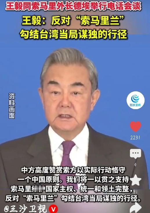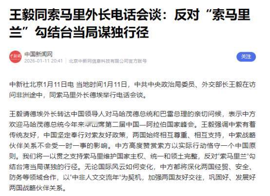 外长亮明态度:“台独”勾结索马里兰,门都没有! 王毅外长直接划红线:坚决反对索马里兰和台当局搞“谋独”勾结!这事说白了特好懂——世界上只有一个中国,台湾就是中国的一部分,这是国际社会都认的理。 既然是人人都懂的道理,台当局为什么还要硬往南墙上撞?答案其实就藏在那个叫“索马里兰”的地方身上,咱们得先搞清楚,这个索马里兰到底是个什么角色。 早年间它是英国的保护地,1960年刚宣布独立没几天,就跟当时意大利托管的索马里南部合并,一起成立了索马里共和国。 可好景不长,1991年索马里内战全面爆发,索马里兰就趁机单方面宣布独立,给自己搞了套地方政府班子。 看着好像是个“国家”的样子,但国际社会压根不承认它,联合国、非洲联盟这些主流国际组织,没一个把它当主权国家看,直到现在它都只是个事实上的分裂实体。 最关键的是索马里联邦政府自始至终都明确表态,索马里兰是自己领土不可分割的一部分,绝不接受任何形式的分裂行径。 就在前不久,以色列突然跳出来宣布承认索马里兰为独立主权国家,还签了所谓的建交协议,这事直接炸了锅。 包括埃及、沙特、土耳其在内的几十个阿拉伯国家,还有伊斯兰合作组织、非洲联盟全都发声谴责,说以色列这是公然违反国际法,干涉索马里内政,会把非洲之角的稳定彻底搅乱。 就是这么个没得到国际社会广泛认可、自身地位极其尴尬的索马里兰,却成了台当局眼里的“香饽饽”。 早在2020年,民进党当局就跟索马里兰眉来眼去,搞了个互设所谓“代表处”的操作,当时就被索马里联邦政府严厉谴责,说这是侵犯自己主权的行为。 台当局心里比谁都清楚,正常国家没人会陪它玩“台独”把戏,就只能找这种同样被孤立的分裂实体抱团取暖,想靠这种旁门左道刷点所谓的“国际存在感”。 更不光彩的是两者之间根本不是什么所谓的“友好合作”,本质就是一场肮脏的金钱交易。 这些年民进党当局一直偷偷给索马里兰的政客及其家人塞钱,用巨额贿赂换对方口头支持“台独”;索马里兰这边也揣着明白装糊涂,拿“两边处境相似”当借口,不停向台当局索要经济援助,把这种勾结当成了赚钱的路子。 前段时间索马里兰还派高官窜访台湾,甚至签了个所谓的“海巡合作协定”,摆明了就是配合台当局搞政治操弄。 台当局满心以为抱上索马里兰的大腿就能突破外交困境,却压根没看清现实。王毅外长在跟索马里外长通电话时就说得很明白,中方坚决反对索马里兰勾结台当局谋“独”的行径,同时也会一如既往支持索马里维护国家主权和领土完整。 事实上不光中国,国际社会绝大多数国家都坚守一个中国原则,联合国大会第2758号决议早就从法律上明确了台湾是中国的一部分,这是任何人都改不了的事实。 索马里联邦政府也用实际行动表明了态度,前不久直接宣布禁止持台湾当局签发旅行证件的人入境或过境,明明白白谴责台当局和索马里兰的勾连侵犯了自己的主权。这波操作不仅狠狠打了台当局的脸,也让索马里兰的处境更尴尬——连索马里中央政府都坚决反对的事,它这种分裂实体搞再多小动作也没用。 可能有人会问,为啥中方对这事反应这么强烈?因为这种勾结本质上就是“分裂势力抱团”,不管是“台独”还是索马里兰的分裂图谋,都是在挑战国家主权和领土完整的底线,这是任何一个主权国家都绝对不能容忍的。 中方推迟王毅外长原定访问索马里的行程,就是对这种分裂勾连行径的明确回应,既让索马里方面看清中方的坚定立场,也给台当局和索马里兰提了个醒。 台当局到现在还没认清形势,看到以色列承认索马里兰就欣喜若狂,觉得自己的“台独”图谋有了希望,这纯属自欺欺人。 以色列这么做是出于自身地缘战略的算计,想靠索马里兰控制红海通道,跟所谓的“支持台独”毫无关系,而且已经遭到了国际社会的普遍反对。 索马里兰自己都还在为获得国际承认四处碰壁,根本给不了台当局任何实质性的支持,两者的勾结最终只会是竹篮打水一场空。 说到底,台当局不管跟谁勾连,不管耍什么花样,都改变不了台湾是中国一部分的事实,也阻挡不了中国统一的历史大势。划下的红线摆在这,国际社会的共识也摆在这,“台独”势力想勾结索马里兰搞分裂,门都没有!那些还在做梦的分裂势力早该醒醒了,再继续一条道走到黑,最终只会自食恶果。