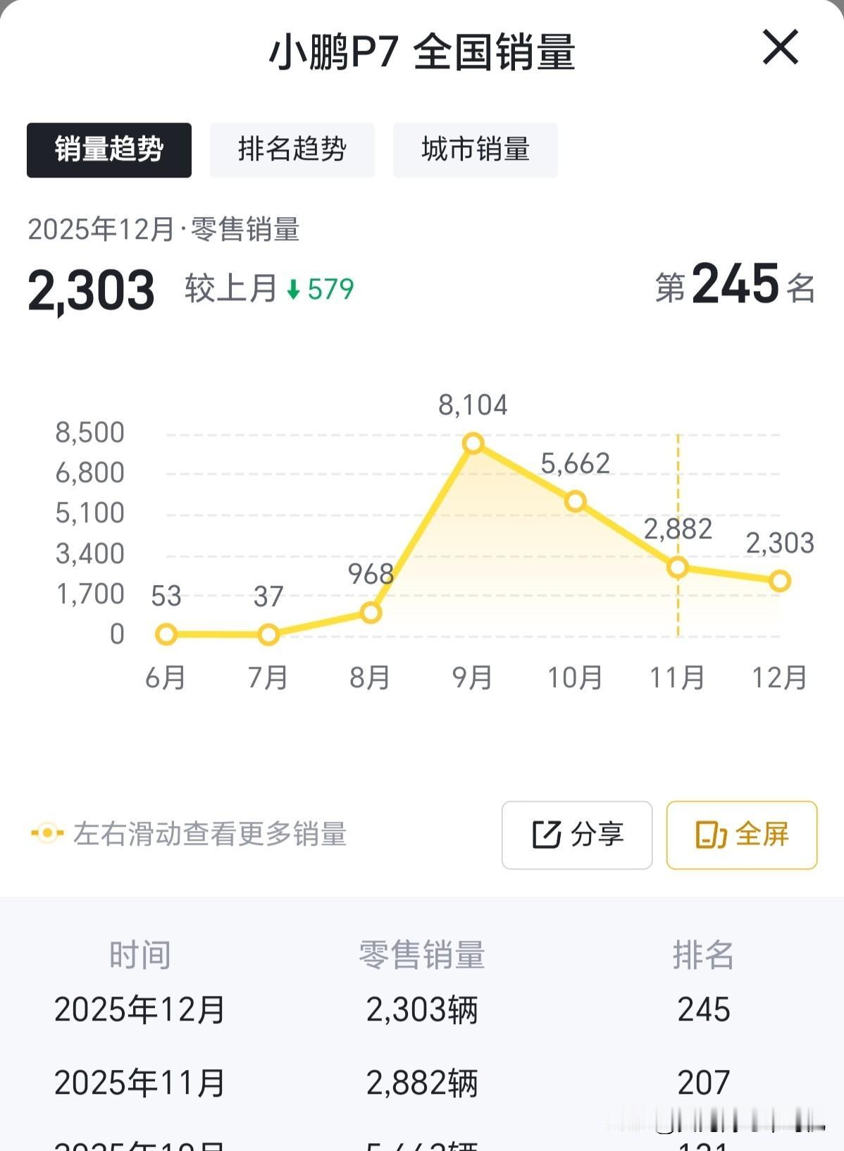 有没有懂行的朋友聊聊咋回事啊?小鹏P7月销量跌到2303台了。 全新小鹏P7刚上市那个月还卖了8104台呢,结果后面连着三个月都在跌,到12月就只剩2303台了。这销量跟差不多定位的小米SU7一比,差距还挺明显的。 说实话,我个人觉得小鹏P7造型挺帅,开起来也蛮舒服的,真不明白为啥销量一直往下走。 而且不光P7这样,小鹏除了MONA M03,其他车型好像也都这个套路——开头一两个月卖得特别猛,后面就跟着往下滑。有了解情况的朋友来分析分析不?到底是为啥呢?