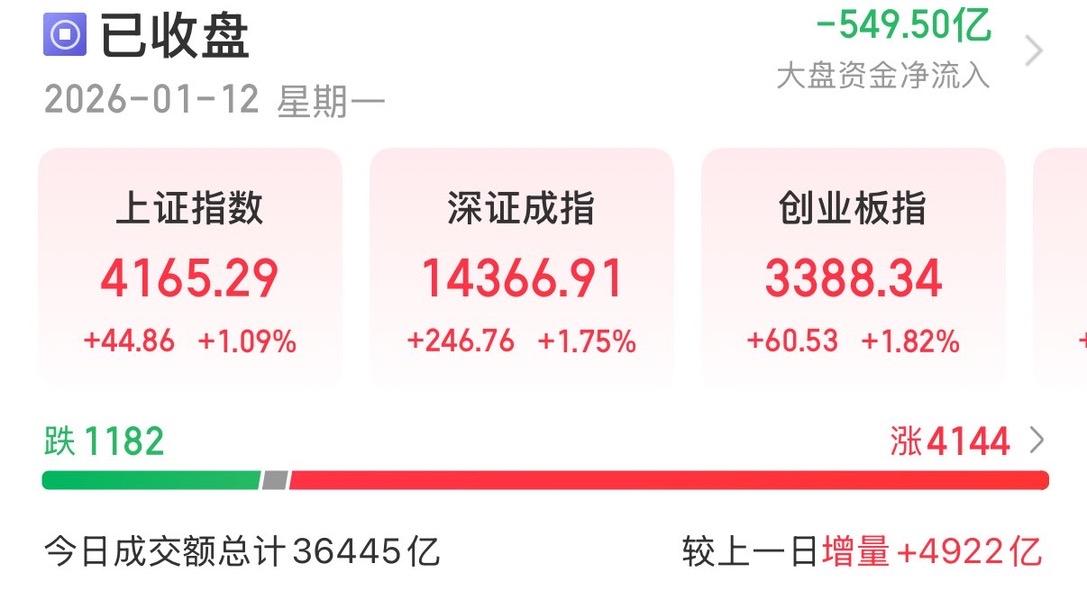 沪指17连阳! 截至收盘:上证指数涨1.09%报4165.29点; 深证成指涨1.75%报14366.91点; 创业板指涨1.82%报3388.34点; 北证50涨5.35%报1605.77点。 …………………………………….. 上涨股票数量超过4100只,罕见超200只股票涨停! 沪深京三市成交额达到36450亿,较上一交易日大幅放量近5000亿,创A股历史最大成交量。 ………………………………… 不敢买高位数,早上逢低买入几只低位股! 别人继续吃大肉,今日我有喝几口汤,知足常乐! ……………………………….. 当市场成交额持续刷新纪录,洪水猛兽也会涌向低位股。 低位绩优股凭借扎实的业绩支撑和合理估值,本就是藏在尘埃里的明珠,在热点轮动的逻辑下,资金自然会从高位热门股流向这些安全边际更高的标的。 这不是偶然的追赶,而是市场必然的选择,更是优质资产应有的价值兑现,补涨不过是迟到的认可与奔赴。 ……………………………………..