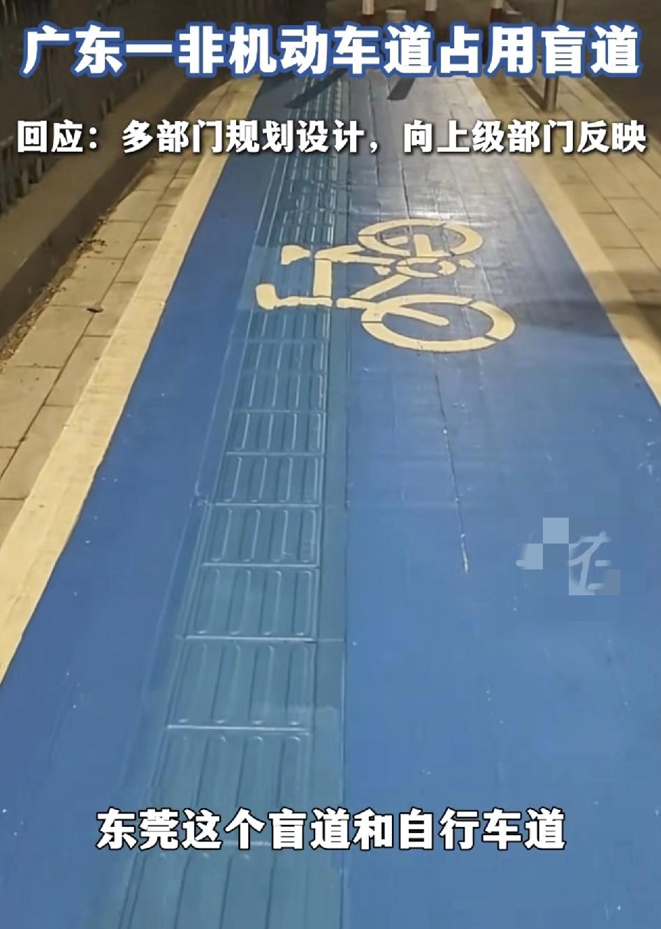广东东莞一位网友发视频称一路段的非机动车到站用了盲道从地面可以清晰的看到,该路段地面以蓝色油漆为主,非机动车道跟盲道是相吻合的,有关部门回应,该路段是经过多部门,多部门的规划设计,如果要更改方案需要。多部门的专业人士现场评估,很多网友觉得这么明显的错误,还不及时更改。