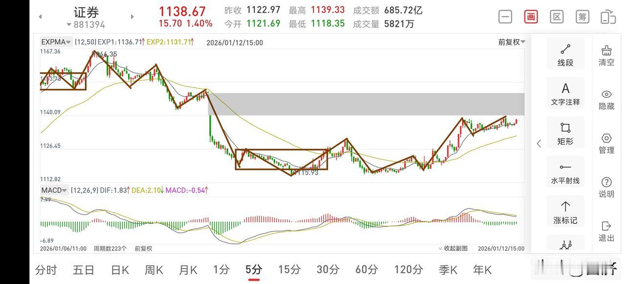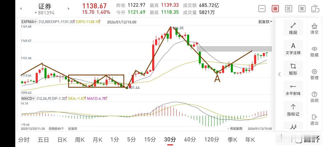 证券板块复盘(2026.1.12) 由于上周末出了很多利好,受此影响,证券板块在略微低走后,震荡强势上涨,我在上午盘中也做出了友情提醒,可考虑加仓二成操作,不知大家有没有跟上节奏呢? 1.从30分钟图一上看,上周在形成三买A点后,逐步向上震荡攀升,目前上方缺口还没有回补完成,那么今天加仓的二成仓位可继续持股观察,看明天的上涨强弱再决定去留。一般而言,macd水下上涨大多数情况下是不会去创新高的,除非大盘强势上涨,证券再出利好,才有可能去实现,但是这种概率应该不大的。 2.从5分钟图二上看,目前形成了5分钟的三买,正在向上进一步攀升,有望去回补上方缺口,此处明天有可能会直接回补上方缺口,也有可能重新构建一个5分钟中枢后再向上回补缺口,总之,明天可继续看多,如果需要减仓,我会在评论区置顶留言,大家可留意。 3.再说说商业航天,此板块具有长期的可持续操作性,跨年妖龙已经出现,之前一些上涨比较好的个股是算不上妖股的,真正的妖龙今天正式腾飞。所以商业航天才刚刚开始,该板块个股将轮番轰炸,带领各主流板块节前走向高潮。证券板块动态 现在做券商晚不晚