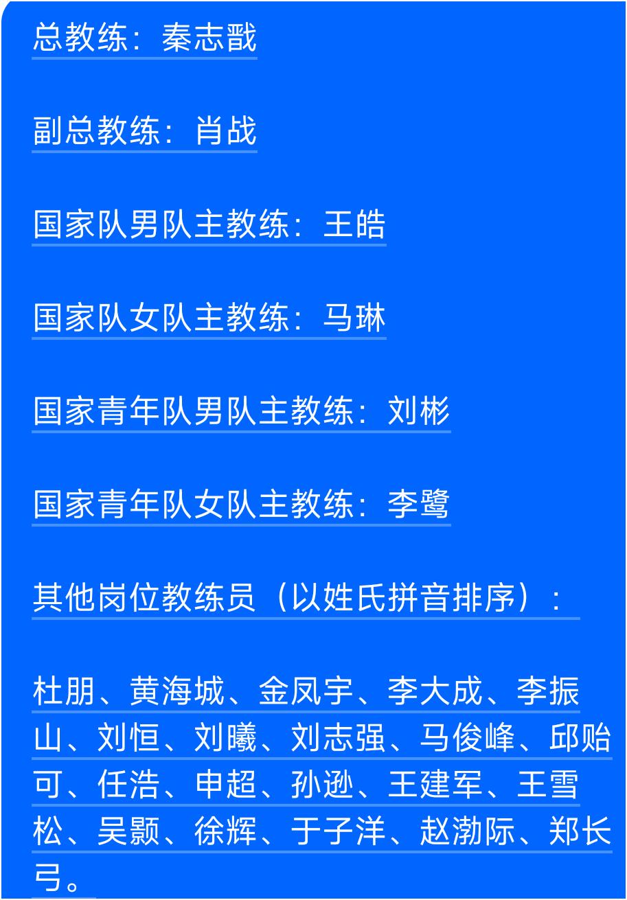 国乒教练组竞聘名单公布了,与预料的差不多。 因为按当时的选拔条件,总教练、副总教练、男队主教练、女队主教练,这四个重要岗位符合条件的人并不是很多。 这里面秦志戬、肖战、王皓编制均在北京先农坛。 总地看来,教练组架构基本变化不大,维持了上一个奥运周期的样子。