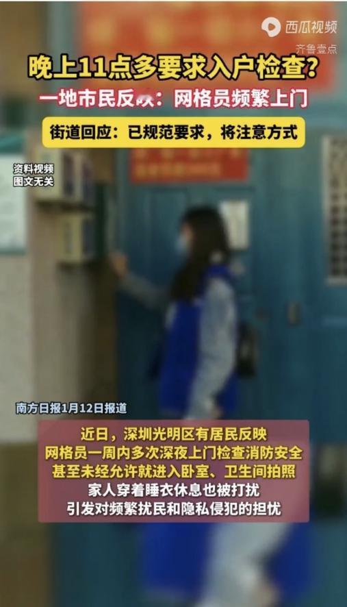 网格员深夜敲门入户检查,被住户投诉。网格员是一个新名词,是特定时候出现的一群特殊的工作人员,要说他们也很辛苦,每天上楼下楼,登记检查。但是,我们有时真的很难分辨他们是真的网格员还是冒牌网格员,其实也存在一定的安全隐患。另外,如果是频繁上门检查,确实是打搅了别人的生活,而且网格员是否有检查权呢,这也值得商榷。虽然说要互相理解,但如果网格员进入家庭检查拍照,住户应当有权拒绝,因为这毕竟还涉及到住户的隐私权。还有很多细节需要规范,相信后面会越来越好。