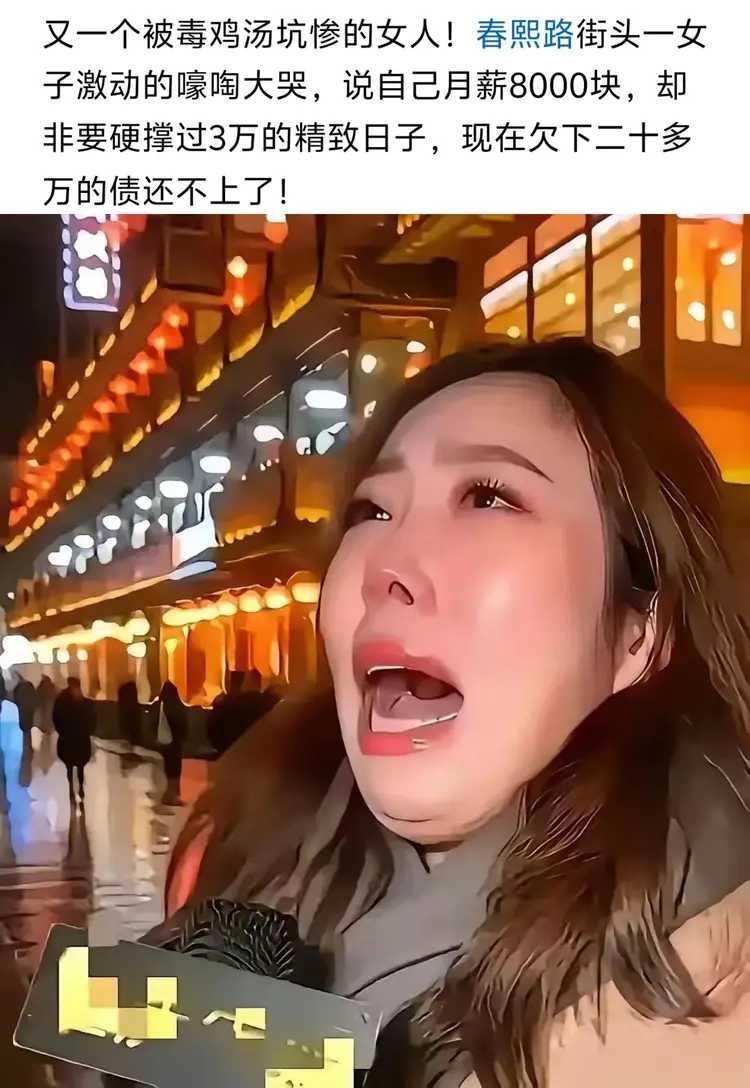 一女子在街头号啕大哭,说自己月薪8000元,却被毒鸡汤迷惑,硬撑着要过30000
