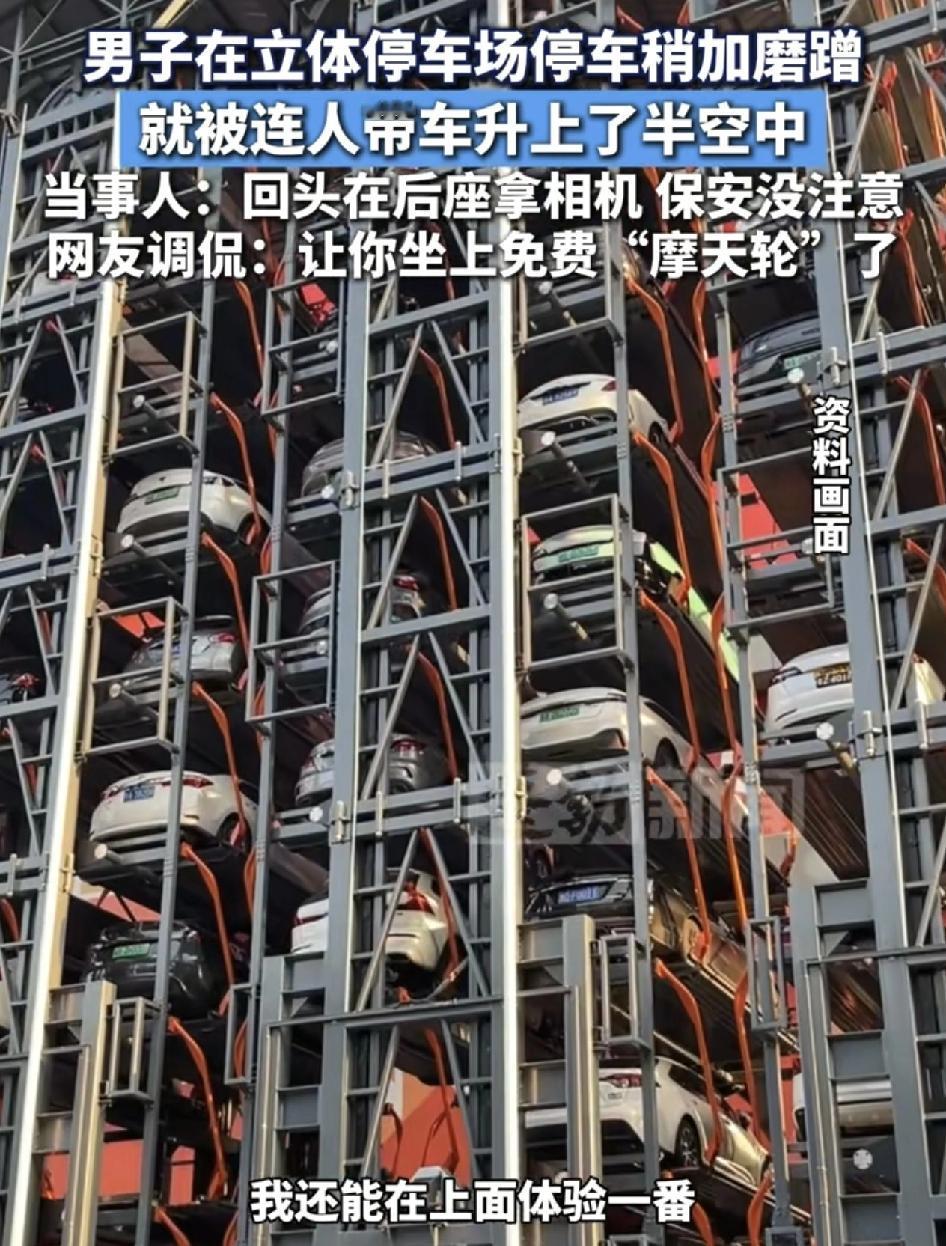 广州一男子在立体停车场内,把车停好,从后座刚拿了一个手机,就这么磨蹭了一下,车位就上升了,当时打开车窗往外喊了一下保安,保安说当时也没有看见,10块钱的停车费,让男子体验了一把摩天轮的感觉。很多人说这种立体停车位。虽然购置能节省空间,但是有时候周边没有安保人员的话,还会有成一定的麻烦。