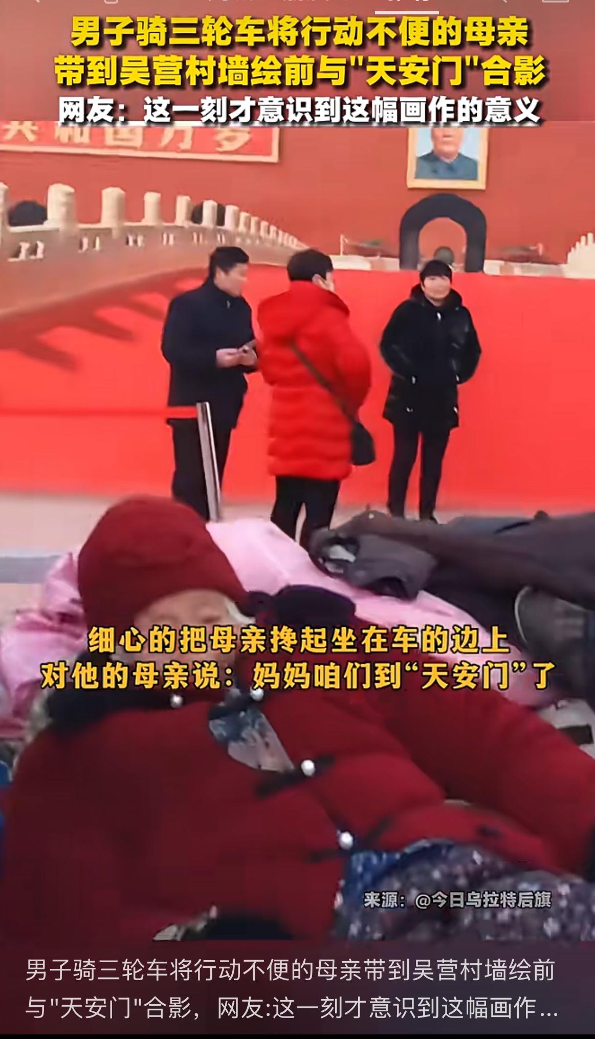 这事儿把我整破防了!! 河南大哥蹬着三轮车,带着97岁行动不便的老妈到吴营村墙绘前,就为跟画里的天安门合张影。 总有人觉得尽孝要等有钱有时间,要带老人去远方看大世界,可这位大叔的做法却打了所有人的脸。老辈人对天安门的执念,从不是非要踏足那片土地,而是那份心愿被放在心上的踏实。吴营村的这幅墙绘,本是普通的乡村艺术,却因为这份孝心,成了最有温度的“圆梦地标”。 你身边还有哪些把长辈心愿放在心上的暖心小事?评论区说说吧。