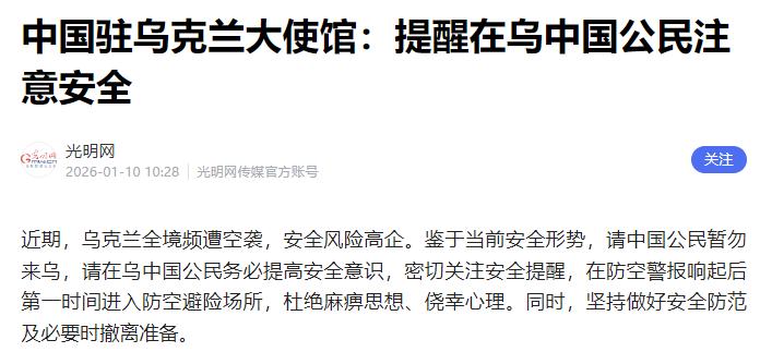 涉重大空袭!继美英之后,中方发出警告!   当地时间1月10日,中国驻乌克兰大使馆发布一则安全通知,提醒近期乌克兰因全境频繁遭遇空袭,安全风险极高,建议中国公民暂时不要前往乌克兰。   而已经在乌的中国公民,大使馆也提醒务必提高安全意识,时刻密切关注官方发布的安全提醒,一旦听到防空警报响起,务必第一时间进入防空避险场所,绝对不能抱有麻痹思想和侥幸心理,同时还要做好必要时的撤离准备。   就在这则通知发布的两天前,美国驻乌使馆的一则公告让乌克兰局势变得人心惶惶。   美国使馆在其官方网站明确告知,已掌握相关情报,未来数天内随时可能出现重大空袭,同时郑重建议在乌美国公民做好万全准备。   公告里还详细列出了具体应对办法,比如提前找好附近避难所的位置,在手机上下载能及时推送空袭警报的应用,储备足够的饮用水、食物和常用药品,一旦听到警报声就得立刻躲进掩体,还要多关注当地媒体的最新消息,听从现场官员和急救人员的指挥。   这份公告里的细节之多,都透露出此次预警的严肃性和紧迫性,也让外界更加确信,即将到来的空袭绝非小规模冲突。这边美国的警告余音未消,那边英国便迅速跟进。   1月9日,英国驻乌克兰大使馆发布了内容相近的警告公告,同样提及收到了潜在重大空袭的相关信息,并且着重敦促在乌英国公民严格遵循乌克兰当局的指示,根据所在地区的实际情况采取对应的安全措施。   之所以美英会如此紧急地发出预警,是源于此前俄乌之间的一次严重冲突升级。   2025年12月28日到29日期间,乌克兰方面动用了91架远程攻击型无人机,从多个方向对俄罗斯境内发动打击,最终目标直指位于诺夫哥罗德州的俄罗斯总统官邸。   不过这次袭击没能成功,俄罗斯防空部队动用了防空导弹、机动火力小组和电子战设备,把所有来袭的无人机都摧毁了,没有造成人员伤亡和财产损失。   但俄方明确表示,这次袭击是乌克兰蓄意策划的恐怖行为,还放出话来会作出最严厉的回应,重新调整在乌克兰问题上的立场。乌克兰方面则坚决否认,称俄方的说法是纯属捏造,目的是为后续袭击乌克兰找借口。   当地时间1月9日凌晨,俄罗斯对乌克兰发动了大规模的无人机和导弹袭击,首都基辅成为主要打击目标。这次袭击从午夜前后开始,基辅的防空警报持续响了五个小时之久。   根据乌克兰方面公布的消息,袭击造成至少4人死亡、25人受伤,其中还有急救医护人员在救援过程中不幸遇难。多个城区的19栋公寓楼、一家幼儿园以及部分关键基础设施都遭到了破坏,导致不少区域供水中断,多处建筑起火,现场一片狼藉。   俄方透露,这次打击动用了包括高超音速导弹在内的多种武器,专门针对乌克兰的关键设施。   就在局势骤然升级的背景下,我国驻乌克兰大使馆于1月10日迅速跟进,发布了针对性的安全提醒,显然俄军的空袭很可能不是只有这一波。   在此也希望在乌的中国同胞能够严格遵守提醒要求,时刻保持警惕,做好安全防护,平安度过这一危险时期。