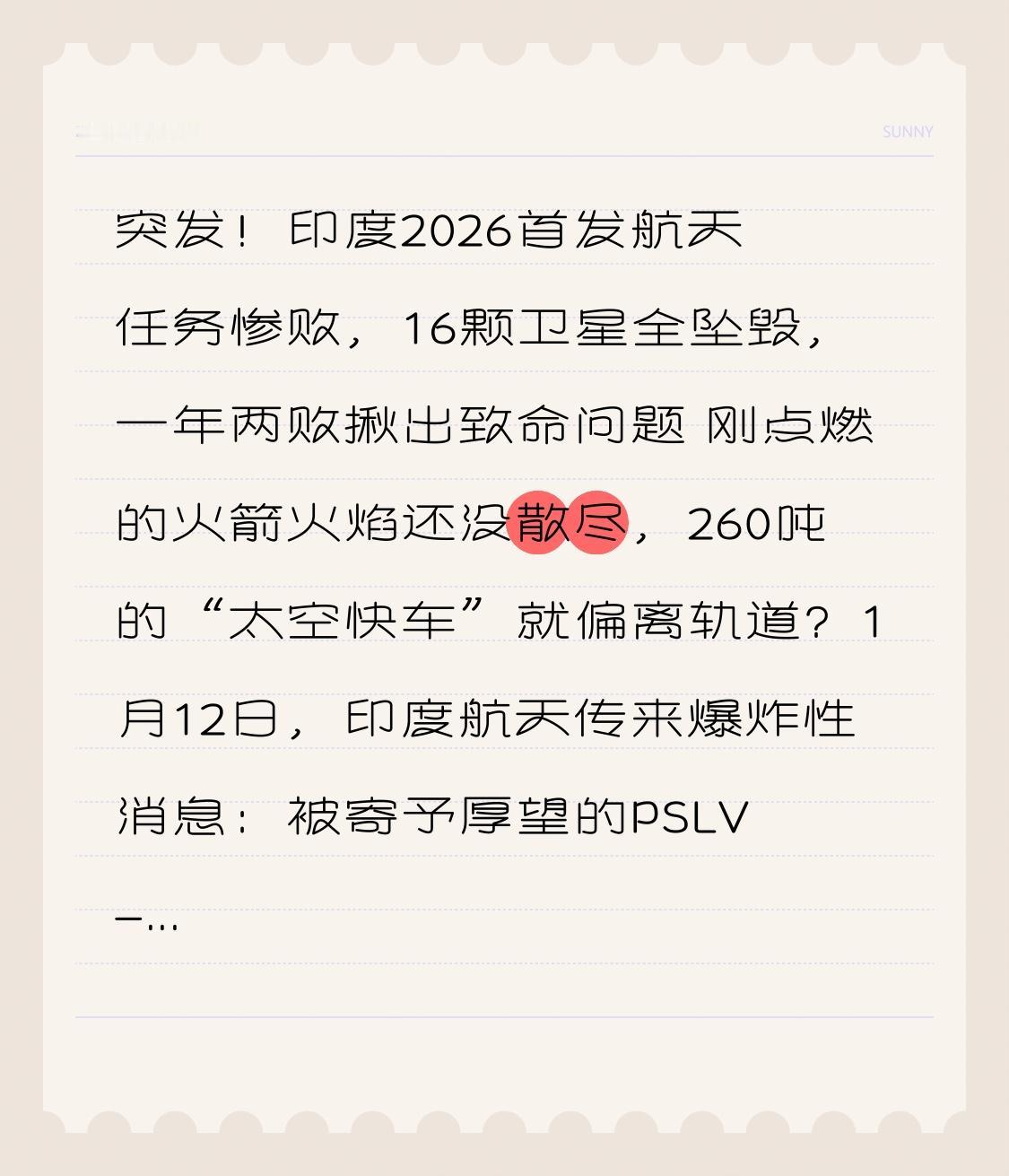 突发!印度2026首发航天任务惨败,16颗卫星全坠毁,一年两败揪出致命问题 刚点燃的火箭火焰还没散尽,260吨的“太空快车”就偏离轨道?1月12日,印度航天传来爆炸性消息:被寄予厚望的PSLV-C62火箭发射任务彻底失败,16颗卫星全部坠毁太空,其中还包括印度国防的战略侦察卫星! 当地时间上午10点18分,萨迪什·达万航天中心人声鼎沸,44.4米高的火箭如期点火升空。前两分钟一切顺利,一级、二级助推器精准分离,控制中心的工程师们甚至已经开始庆祝。可就在第三级发动机工作末期,屏幕上的参数突然失控——燃烧室压力骤降,推力瞬间不足,火箭像脱缰的野马偏离预定轨道,所有补救指令都石沉大海。 随着ISRO主席维潘·纳拉亚南沉重宣布“任务失败”,现场瞬间陷入死寂。这次坠毁的不只是普通卫星:主星EOS-N1是能从500公里外识别军事伪装的战略资产,还有15颗商业伴星和西班牙的再入技术演示舱,整批载荷价值连城,如今全成了太空垃圾。更让人揪心的是,这已经是PSLV系列火箭不到一年内的第二次惨败!2025年5月,同样是第三级发动机故障,导致价值2.8亿美元的卫星坠毁。 要知道,PSLV曾是印度航天的“金牌火箭”,63次飞行仅1次完全失败,还成功执行过月船1号、火星轨道器等里程碑任务,成功率高达86.5%。可短短八个月内连续栽在同一个坑上,彻底撕开了印度航天的技术短板。初步调查显示,两次失败都指向第三级发动机的设计缺陷或测试漏洞,这个“致命短板”让印度的国际商业发射订单岌岌可危。 有人说这是“出师不利”,但回顾航天史就知道,没有谁能一帆风顺。俄罗斯质子-M火箭曾五年七败,日本H2A火箭多次空中自毁,韩国罗老号更是命运多舛 。航天探索本就是在失败中前行,每一次爆炸都是向成功的靠近。但连续两次栽在同一问题上,却暴露了流程管控的漏洞——是急于抢占市场忽视了测试,还是技术迭代跟不上野心? 从1980年首次成功发射卫星,到如今冲击商业航天市场,印度航天的努力值得尊重,但“欲速则不达”的道理在太空领域尤为明显。毕竟,航天事业容不得半点侥幸,每一个零件的疏忽,都可能让亿万投入化为灰烬。 航天探索从来没有平坦大道,中国长征火箭也曾经历过失败,正是在一次次复盘改进中,才创下如今的高成功率。这次印度的失利,也是全人类航天事业的一次警醒。 你觉得印度能尽快解决技术漏洞吗?各国航天探索该如何平衡速度与安全?评论区留下你的观点,点赞转发,一起为人类的太空梦加油!