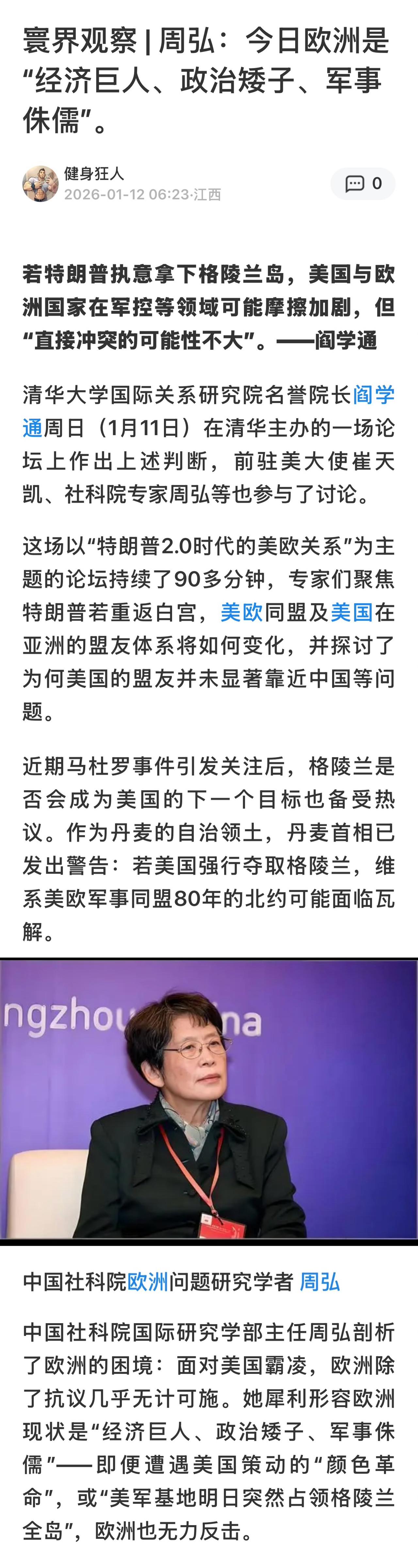 周弘:欧洲面对美国霸凌,除了抗议,难有大作为 她说,甚至如果美国动用“颜色革命”,或“明天早上醒来美军基地已经占领全(格陵兰)岛,但欧洲能干什么?”