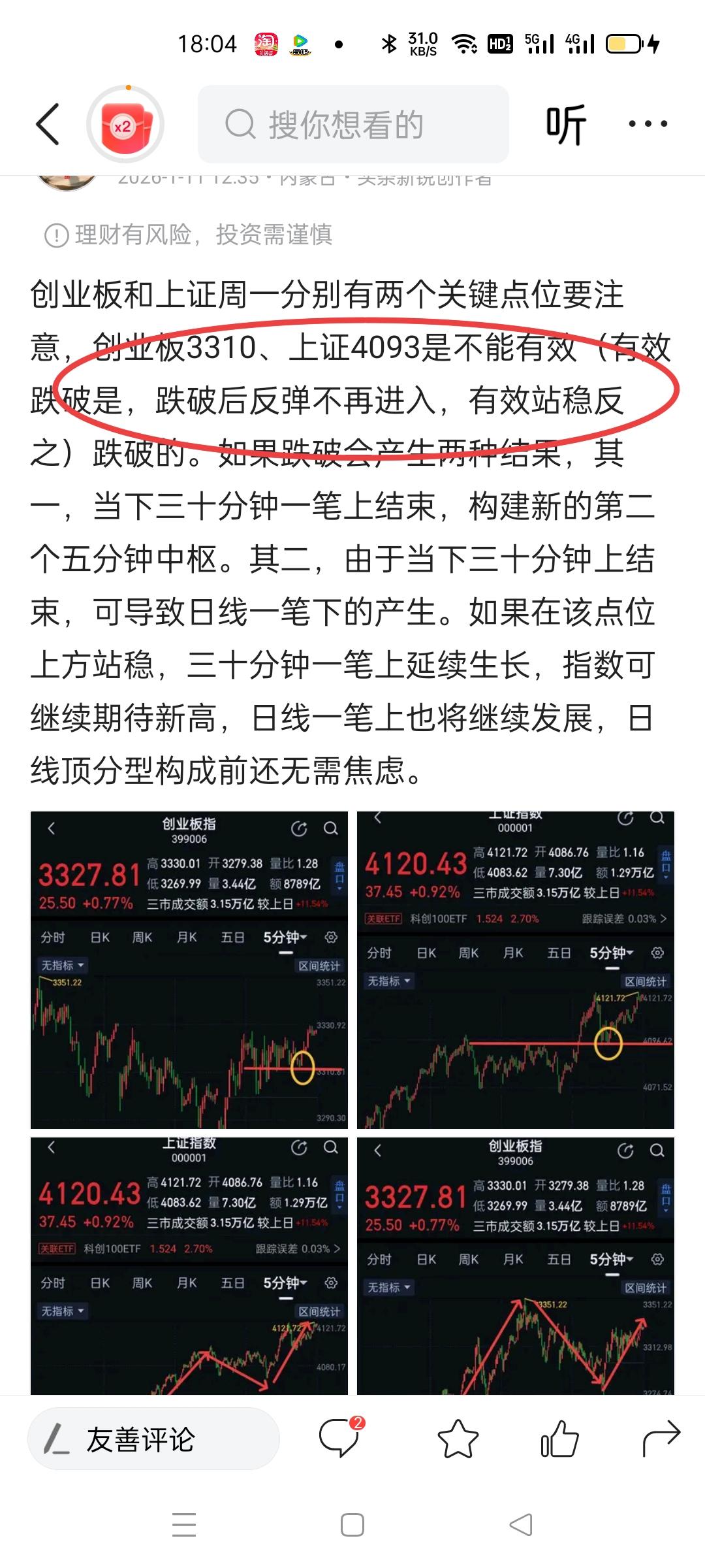 创业板、上证,上证明天要观察是否围绕图〈1〉的一分钟中枢(4069~4094)形成背驰。如背驰回调不破坏中枢,还可以谨慎用多头思维去跟;如中枢破坏,可等5分钟反弹择机退出。如不背驰,观察是否形成三买,形成继续跟随上涨。创业板今早盘低点3282,随后的反弹并未形成对3310的有效破坏。明天只需3330有效站稳,可继续多头思维去跟随上涨。日线顶分型形成前还无需过度焦虑,跟随上涨即可。