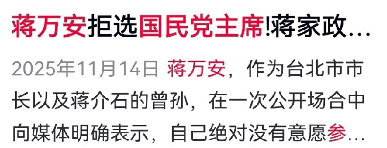 蒋万安公开表态不参选国民党主席,这一决定被外界视为清醒而务实的选择。 作为蒋介石曾孙,他并未依赖家族光环,而是凭借哈佛学历与扎实市政成绩走出自己的路。任台北市长以来,他勤跑基层,施政满意度显著提升,成为蓝营重要战力。 国民党主席一职如今堪称“烫手山芋”,不仅派系纷争不断,还需应对财务与选举压力。 蒋万安缺乏派系与军系背景,若贸然投入恐难驾驭。相反,他选择巩固台北政绩,在“卢蒋韩”铁三角中稳扎稳打,持续积累政治资本。 此番拒绝,既避开了党内激烈缠斗,也为未来更长远的发展保留实力。 蒋万安显然更愿以专业政绩赢得认可,而非依赖家族符号。他的选择,或许正勾勒出一条属于新一代的政治路径。 对此你怎么看?