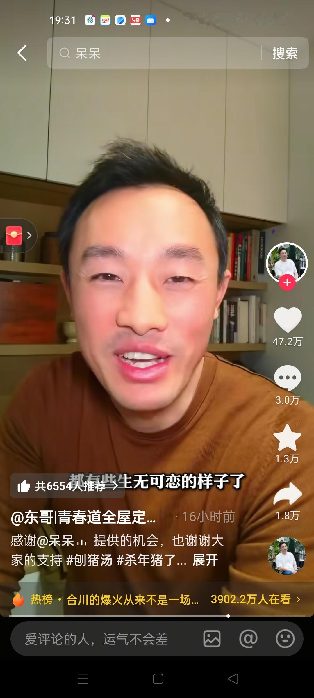 我敢断言,呆呆家的按猪活动, 最幸福的应该是送猪哥, 不是那262斤的猪,而是他“居心叵测”,居然是蹭流量的! 他说自己动机不纯,心眼不坏,感受到久违的乡村年味!一月17号周六,自己办一场刨猪汤盛宴! 还带有当地的特色,水八碗坝坝席,土鸡土鸭!一定要把重庆的年猪文化办起来! 大家会去重庆送猪哥那吃刨猪汤吗? 重庆网红呆呆