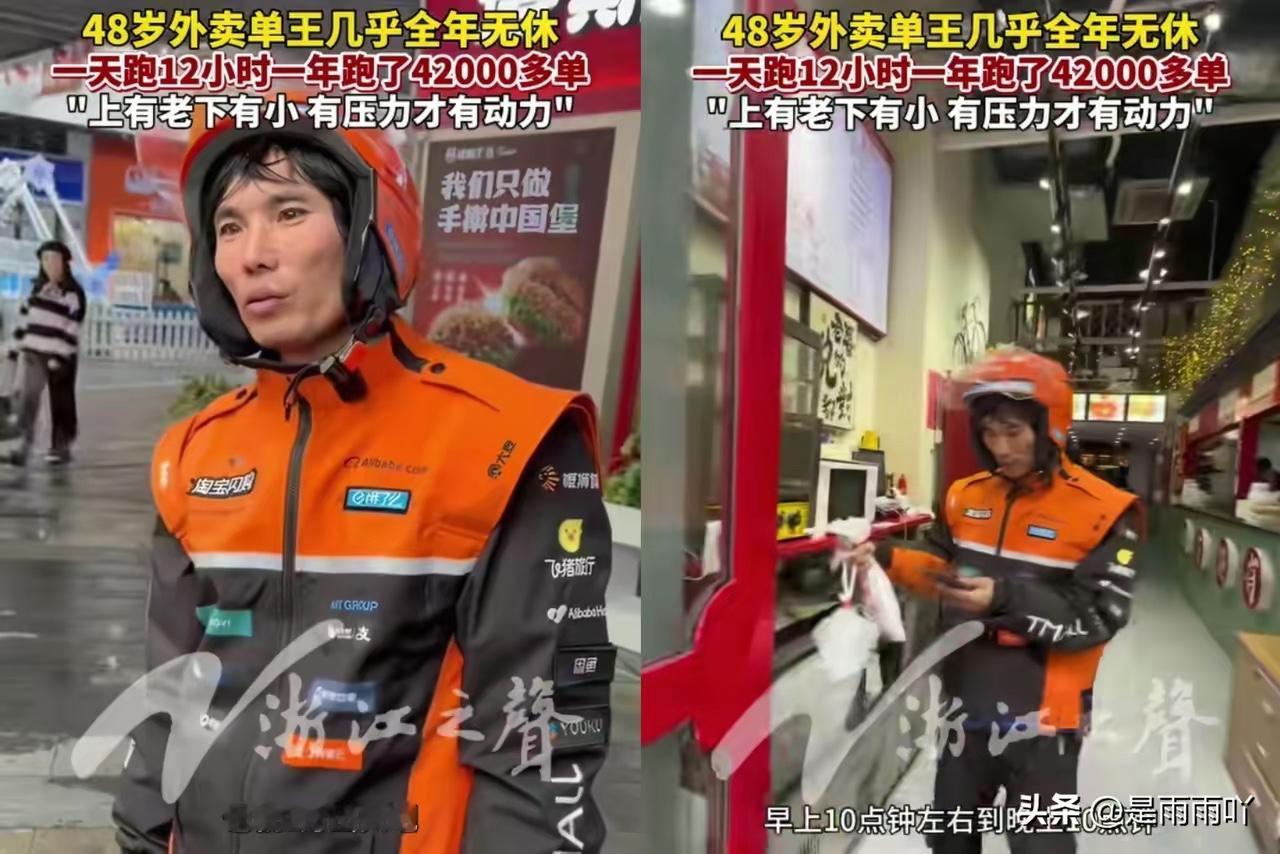 不得不说 这大哥是真猛呀 浙江一外卖大哥,48岁的人了,一年365天愣是一天没歇,每天在外头跑12个小时。 起初同行还嘲讽他“想钱想疯”,可年底单量一出,42000单,直接让全场闭嘴,平均每天115单,这强度,铁人也扛不住啊! 先不说真假,这样的劳动强度是不可取的,对自身健康不负责任,倒下了对家庭也是噩耗,对同行业更是背刺。欧美企业有一个叫“强制休假”的制度,逼迫你休息,让你和家人在一起,这才是展现人文关怀。 合租的有两个跑外卖的。一个大哥 七点多起床跑晚上九点多左右回来。晚上鼾声我房间都听得到。另一个小哥十点多起床 八点多回来收工。半夜三点多还看他房间里灯亮着,打游戏。 没好意思问他们这行的具体情况。 这不是勤劳,更不是美德,这是一个被资本压榨的躯体痛苦挣扎,求生不得求死不能的故事,这不应该拿来宣扬,应该追根溯源,讨论其出现的原因。