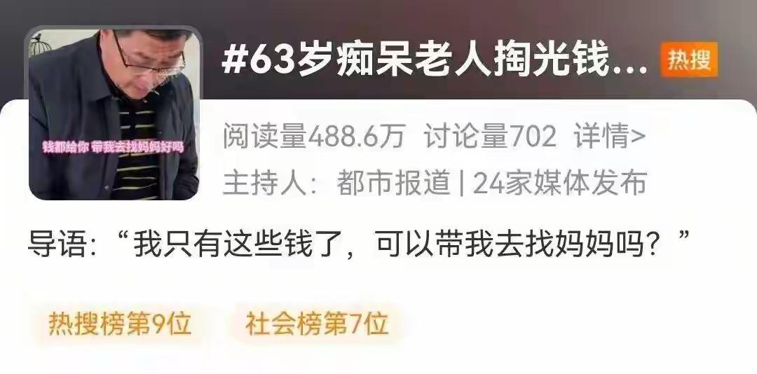 63岁老年痴呆父亲颤巍巍掏出所有钱,哽咽求女儿:可以带我去找妈妈吗?戳中无数网友泪点……原来,这位父亲的老伴儿因疾病离世已经两年了。在老伴走后不久,他便患上了老年痴呆,记忆开始一点点消散。但在他逐渐模糊的记忆里,妻子的模样却始终清晰。 女儿看着父亲颤抖着双手把那皱巴巴的钱递到自己面前,眼眶早已湿润。她知道,父亲虽然很多事都不记得了,可对母亲的爱却从未改变。 为了满足父亲这个心愿,女儿带着父亲回到了他们曾经生活过的老房子。那是父母相识、相知、相爱的地方,每一处角落都藏着他们的回忆。父亲一走进屋子,眼神里闪过一丝光亮,他缓缓地在屋内踱步,嘴里喃喃着母亲的名字。 女儿陪着父亲坐在院子里,给父亲讲着过去的故事,讲父母年轻时的浪漫,讲一家人曾经的温馨时光。父亲时而点头,时而露出微笑,仿佛又回到了那些美好的日子。 尽管母亲已经不在了,但女儿觉得,这一刻,父亲是幸福的。她也明白了,爱不会因为时间和疾病而消逝,它会永远留在人们的心中。这个故事也让更多人懂得珍惜身边的人,珍惜当下的爱。