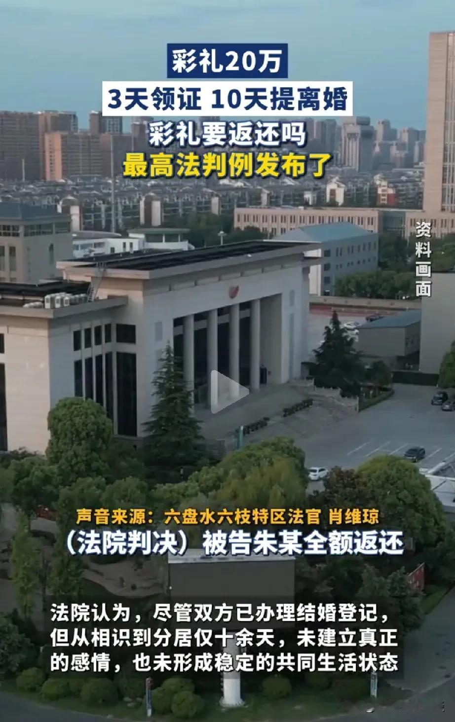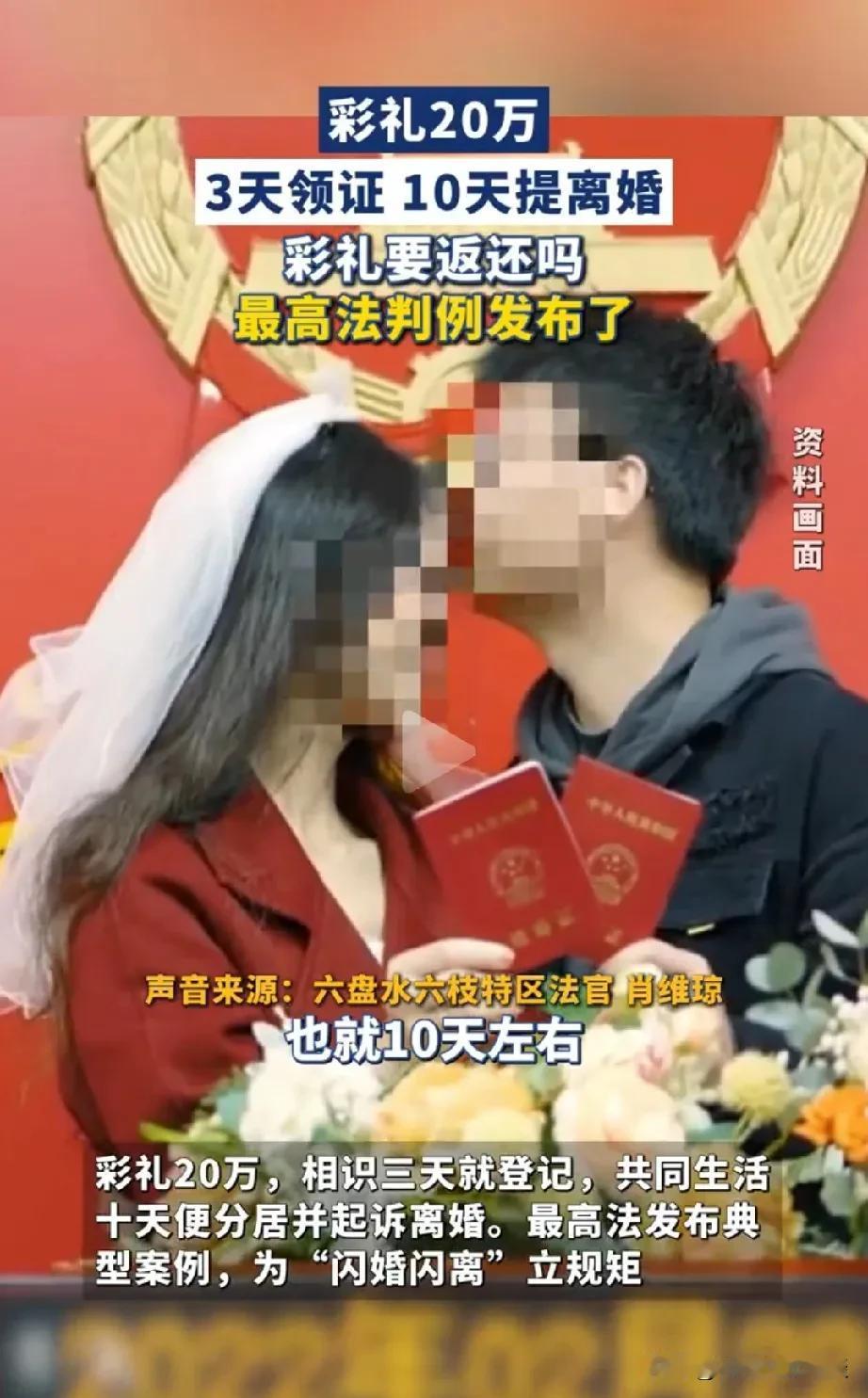 这个案例让那些通过闪婚,短时间再离婚的女子心惊胆战。女子和通过相亲认识的男子,短时间内闪婚,收了对方20万彩礼。但是只结婚了10天,女的就是以性格不合为理由离婚。 男子将其起诉法院要宣判了,因为两个人没有实质性生活在一起,彩礼也没有购买共同的生活用品,所以法院判女子,将20万彩礼全部返还给男方。 通过这个案例,告知那些想通过结婚骗取对方彩礼的女人们,要小心了,到时候人财两空,赔了夫人又折兵。