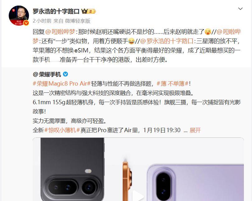 罗永浩谈荣耀Magic8 Pro Air! 三星为了做薄,连机身都放不平稳;苹果为了做薄,连实体SIM卡槽都想砍掉——结果各方面平衡得最好的,反而是荣耀这款,成了他近期最想买的手机。“准备弄一台干干净净的港版,出差用。” 他顺带调侃了当时的荣耀CEO赵明:“赵明起初还嘴硬,说这不是抄的……结果没多久,他人就走了。”[捂脸]