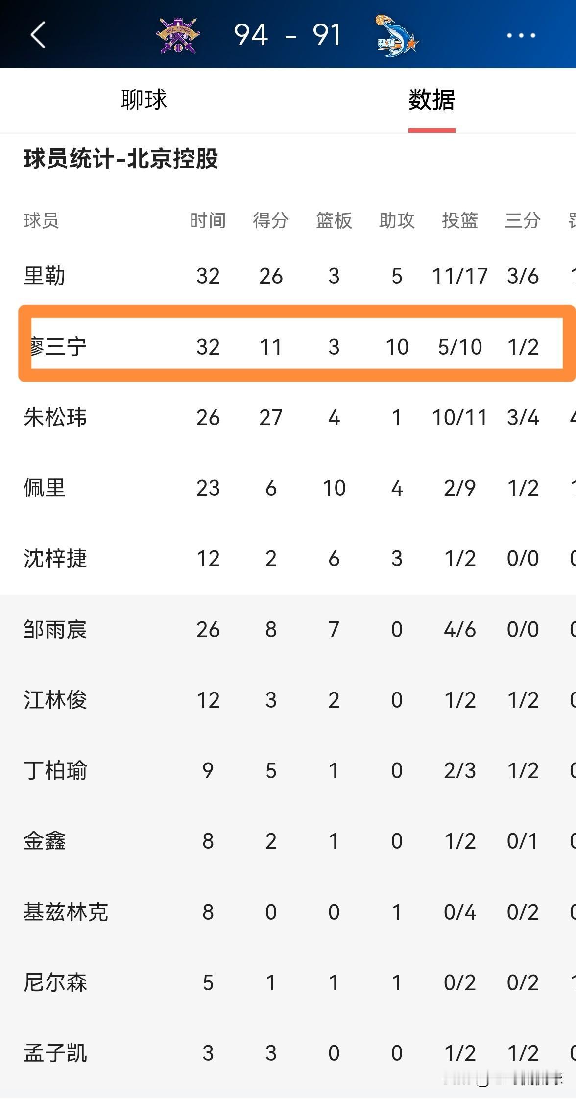 北京控股当家控卫廖三宁真是一名大心脏球员!在今天北京控股主场以94:91险胜福建晋江文旅的比赛中,廖三宁在比赛最后时刻投进了一记极其精彩的三分球,帮助球队绝杀了对手。 全场比赛下来,廖三宁首发出战32分钟,投篮10中5,其中三分球2中1砍下11分3篮板10助攻。