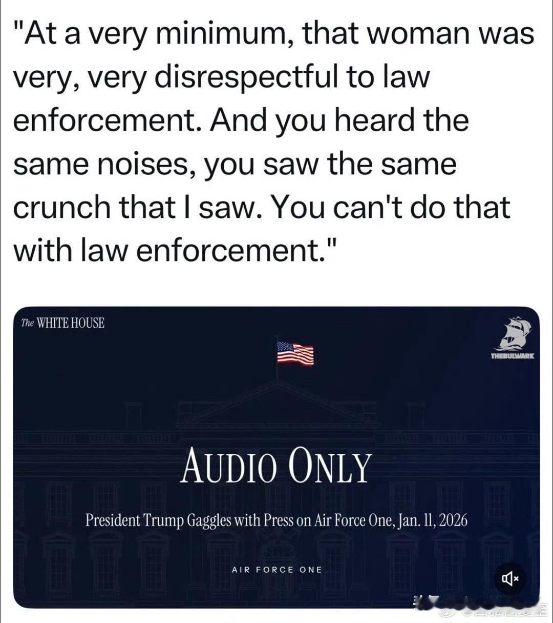 美国总统在空军一号,评论移民执法枪杀美国公民事件: “别的不说,至少那个女的,对执法人员非常、非常不尊重…你不能那样对待执法的人” 。 2026年1月7日,美国移民与海关执法局(ICE)人员在明尼苏达州明尼阿波利斯市执行任务时,开枪打死37岁美国公民蕾恩·妮科尔·古德。监控视频显示,古德的车辆在道路上静止后,执法人员要求其开门,车辆移动时一名执法人员近距离开枪。 特朗普最初在社交媒体称,古德试图“碾压”执法人员,开枪是“自卫行为”,但观看视频后改口表示“这一幕太可怕了”“不想看到这种场景”。他未直接回应ICE是否反应过度,而是将责任归咎于前总统拜登的移民政策,称“执法人员被迫采取行动”。明尼阿波利斯市长雅各布·弗雷反驳特朗普的说法,称视频未显示古德用车冲撞执法人员的证据。事件引发当地数千人抗议,古德的母亲表示她可能“被吓坏了”才试图驾车离开。 特朗普的最新表态,显然有失偏颇,因为对执法人员表现不尊重,就可以开枪将人打死?