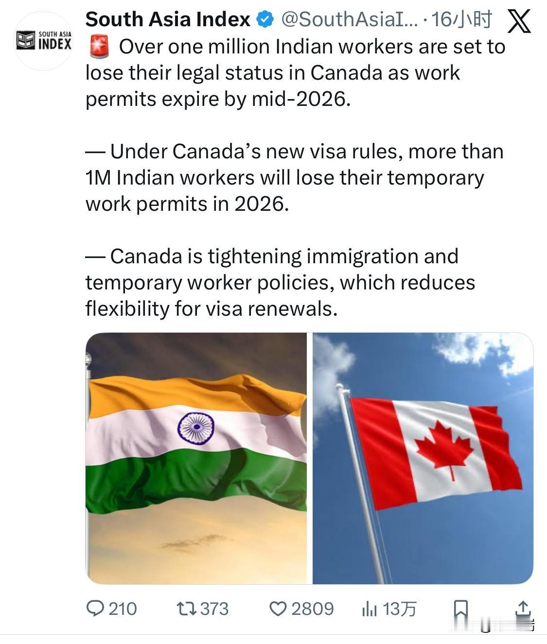 到 2026 年年中,超过一百万印度工人将失去在加拿大的合法身份,因为他们的工作许可即将到期。 — 根据加拿大新的签证规定,2026 年将有超过 100 万印度工人失去临时工作许可。 — 加拿大正在收紧移民和临时工政策,这降低了签证续签的灵活性。