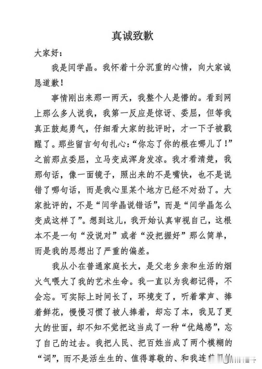 闫学晶与儿子一起道歉![捂脸] 闫学晶彻底塌房了,账号被封,代言被取消,儿子学历被质疑,这下知道道歉了吗?还是喜欢你桀骜不驯的样子! 只能说祸从口出,闫学晶在直播中透露儿子一家收入,称“就挣个几十万,无法维持家庭运转”,其相关言论被质疑“哭穷”。 当网友提出疑问时,闫学晶还怒怼网友,调侃网友是“酸黄瓜”,选择和网友硬刚到底。 随后网友对其家庭进行深扒发现,一件比一件有料,这次的事情,可能不是道个歉,就能过得去的了。 整不好不只是她自己彻底塌房,包括她儿子在内,估计也够呛,尤其是那北京户口和中戏新疆班问题! 眼看事情越发严重,闫学晶立马出来道歉了,其儿子林傲霏也在个人社交媒体账号发布了其母的道歉书,并留言“娘的错,儿子担!感谢大家的监督批评!我们错了。再一次向大家真挚的道歉:对不起”。 只能说是祸从口出呀!你要是低调一点不出来显摆,也不会把自己拖下水,归根结底就是“飘了”,忘记曾经自己也是农民啦!如何看待闫学晶言论争议