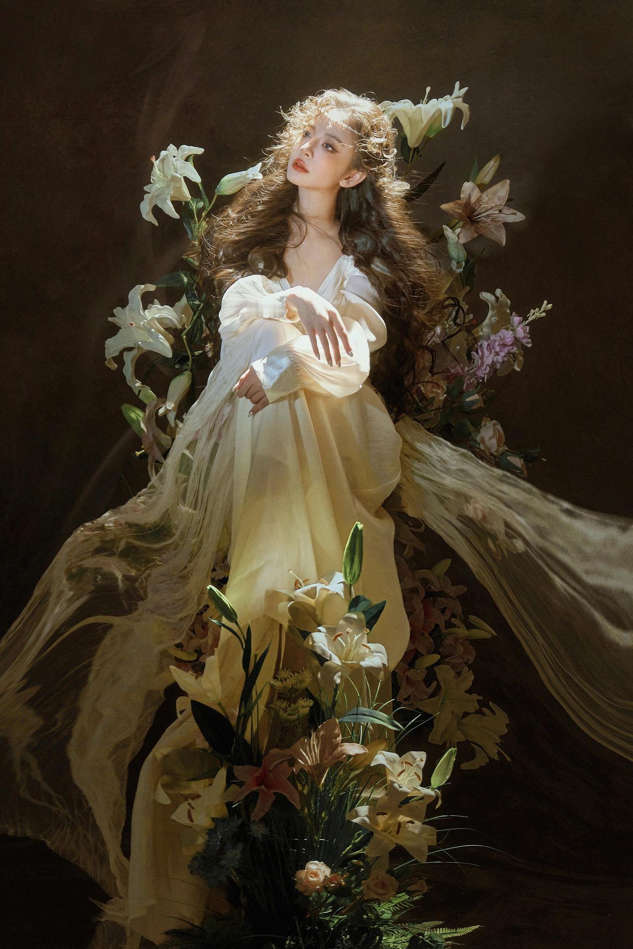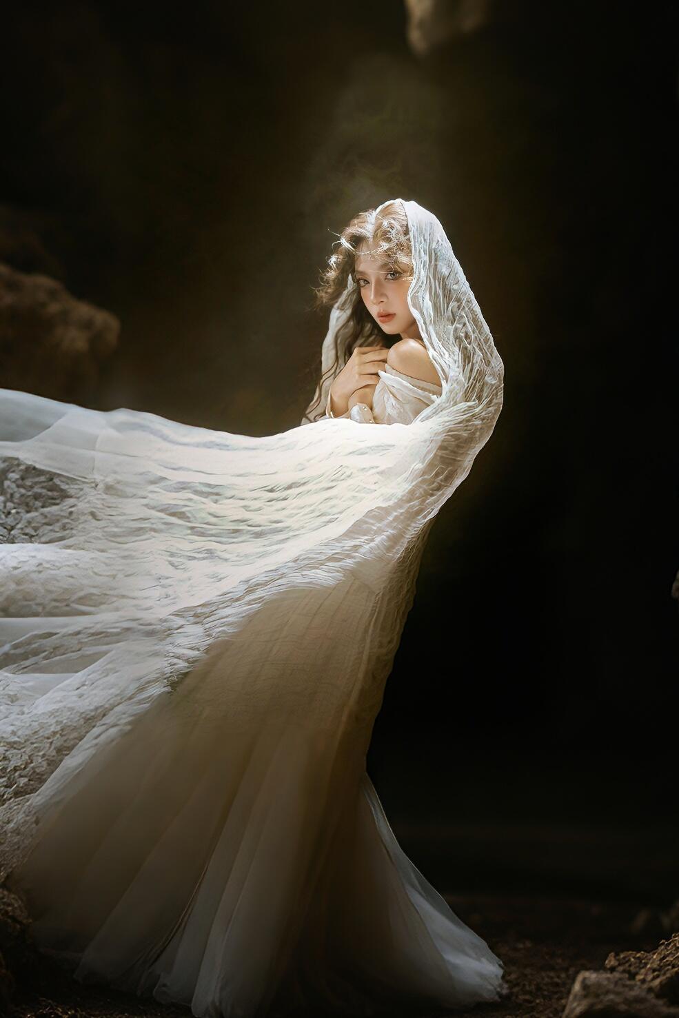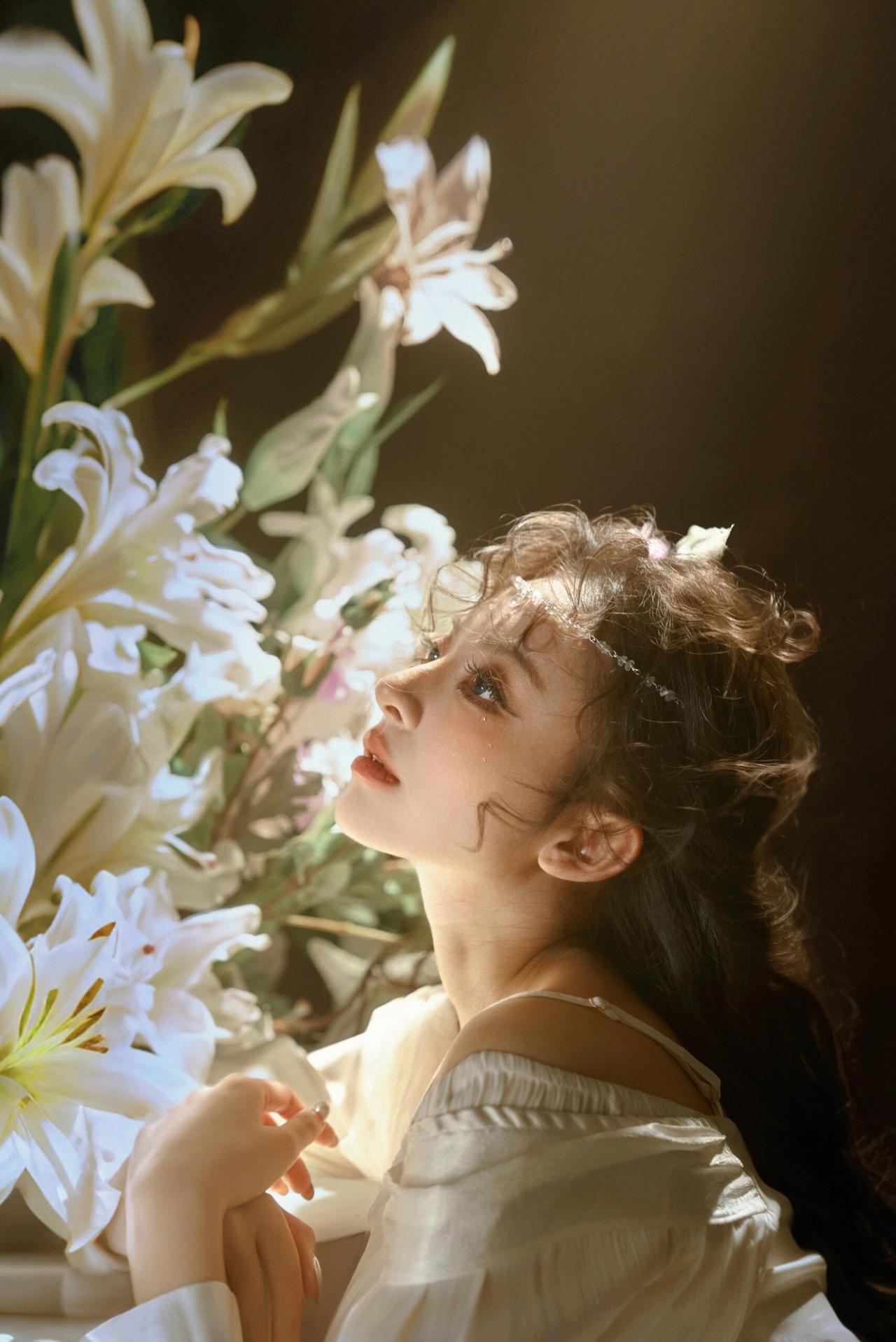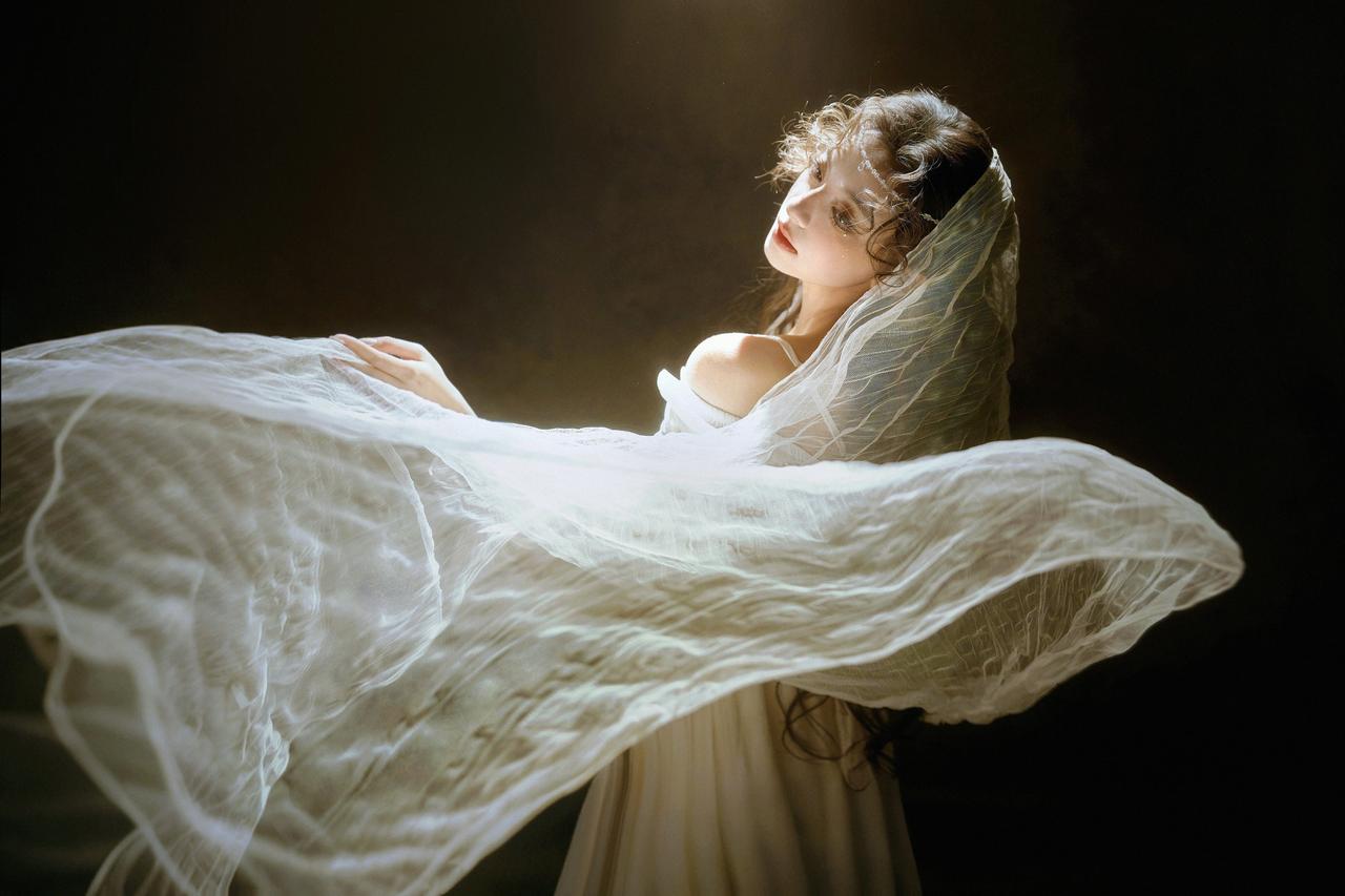 这组婚纱写真以“暗调光影+花艺叙事”为核心,首图蜡烛侧光塑造的轮廓感堪称点睛之笔。暖调烛光在人物面部形成明暗渐变,纱质头纱的半透明质感与光影交织,既保留了皮肤的细腻肌理,又通过明暗对比强化了画面的故事性。美中不足的是蜡烛光源稍显单一,人物颈部下方的阴影略重,若辅以反光板轻补柔光,能让面部层次更通透。 第二张百合花丛中的仰拍视角,利用花卉的自然层次做前景,人物侧脸与花枝形成错落的线条关系,眼神望向光源的动态让画面产生向上的张力。但花丛的密度稍显杂乱,部分花枝遮挡了人物肩部线条,若精简右侧多余花茎,画面的呼吸感会更强。整体色调统一在暖棕系,低饱和的色彩处理契合唯美婚纱的氛围,光影与花艺的结合让画面兼具浪漫与叙事性。