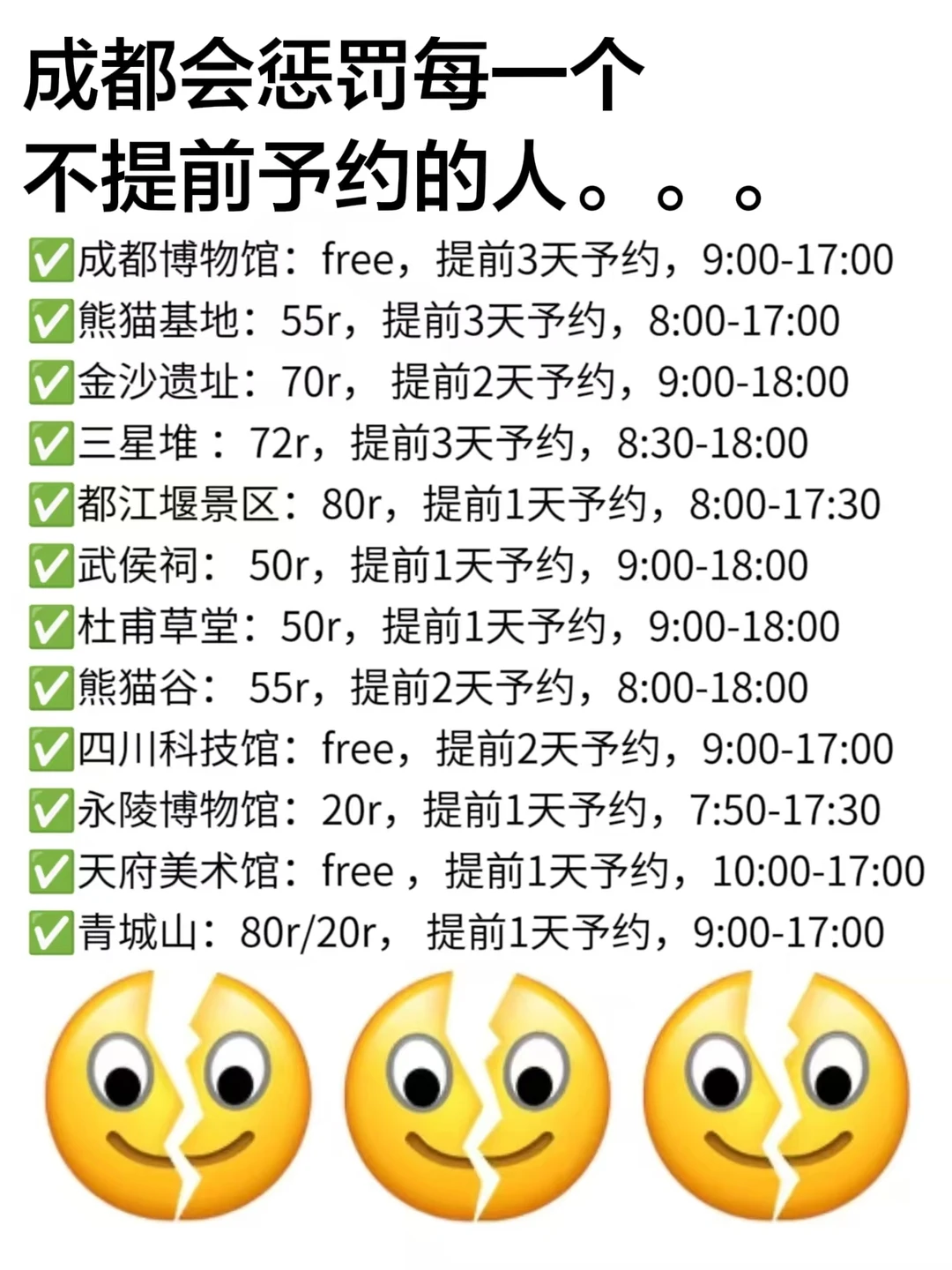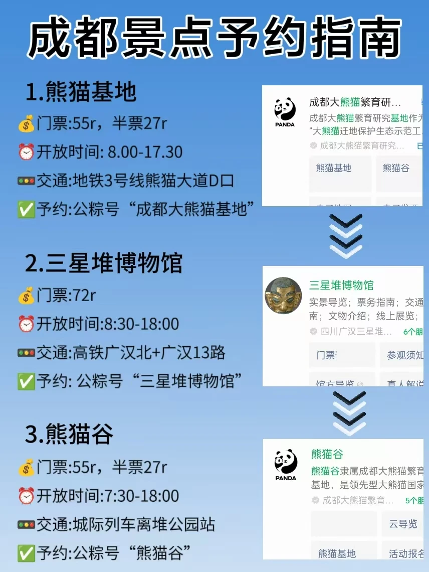 📢成都博物馆:free$ 提前5天予约 9:00-17:00📢熊猫基地: 55r💰 提前7天予约8:00-17:00📢金沙遗址: 70r💰提前3天予约9:00-18:00