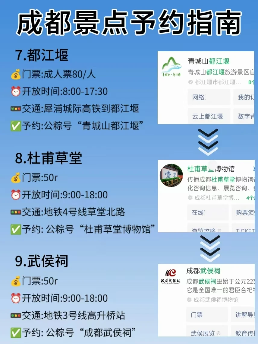 📢都江堰景区:80r💰提前5天予约 8:00-17:30📢武侯祠 :50rs💰提前1天予约9:00-18:00