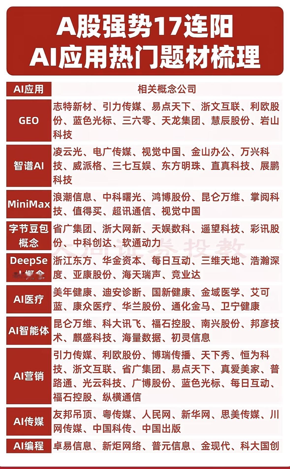 A股强势17连阳,AI应用热门公司梳理 AI概念股全线爆发:传媒、医疗、智能体、营销多领域联动,昆仑万维、蓝色光标等领涨,科技浪潮持续升温。