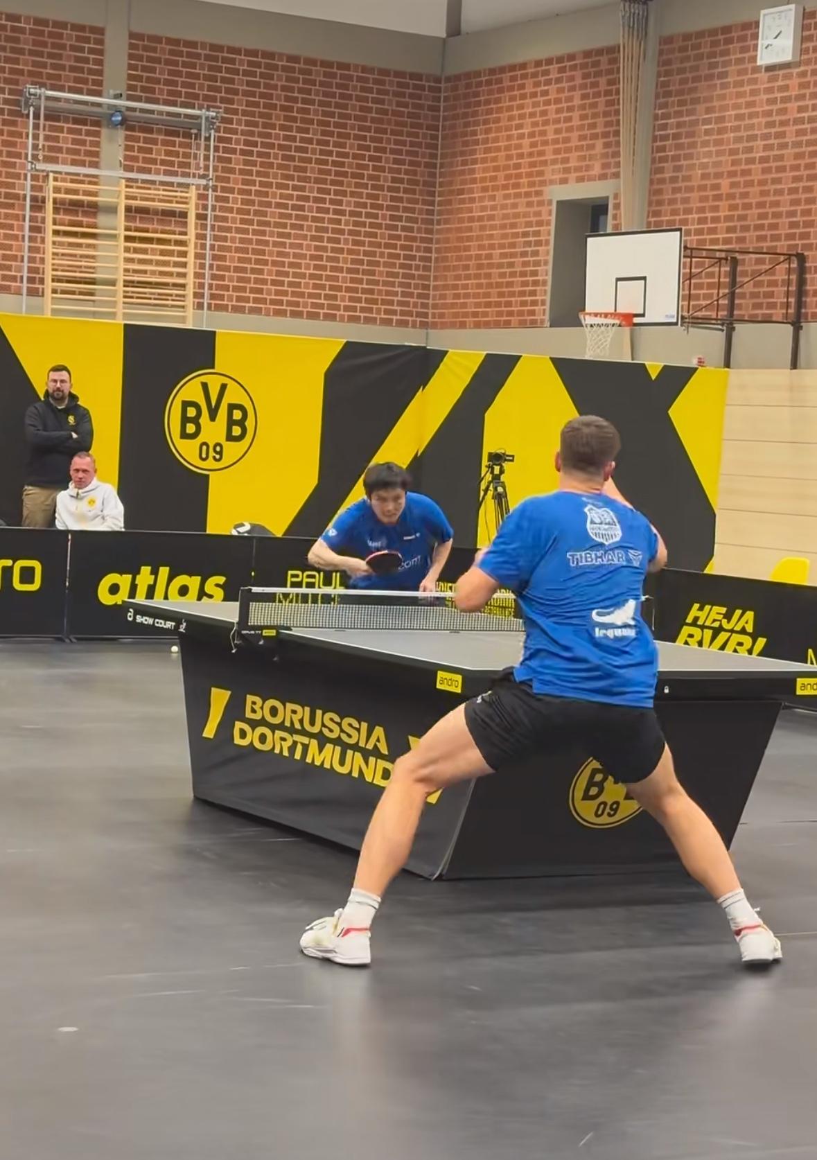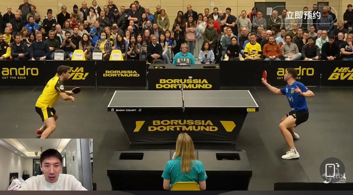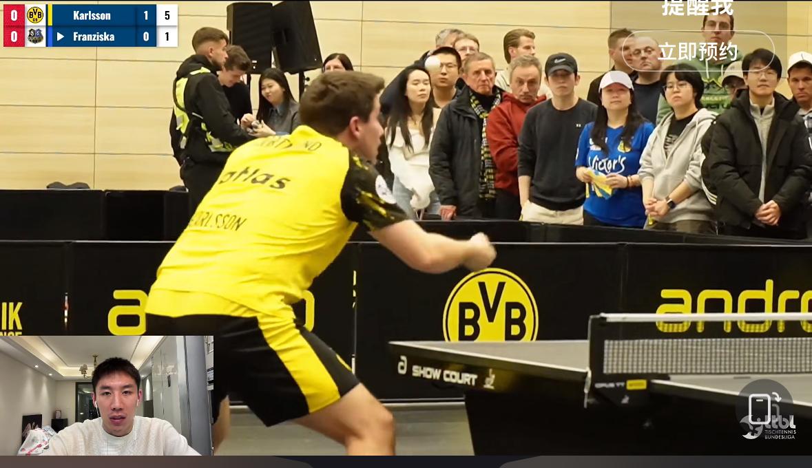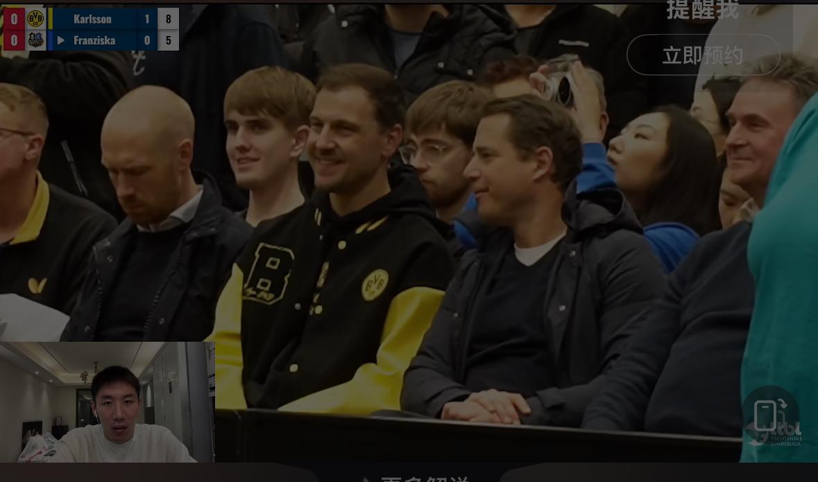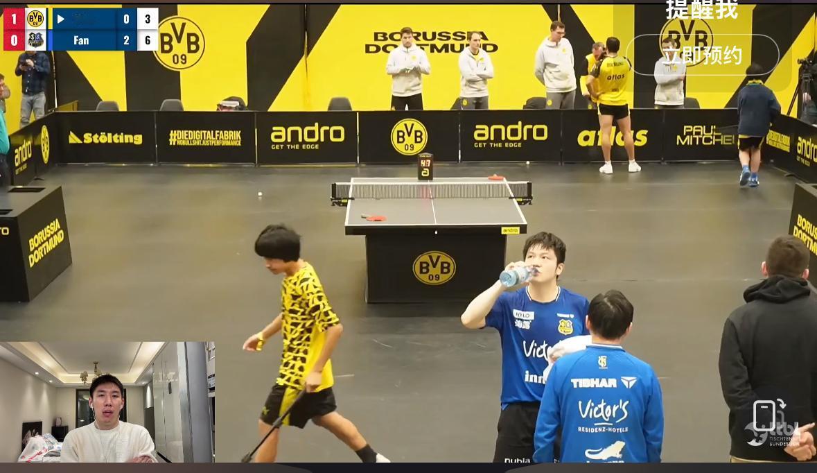 2026樊振东德甲第一战——樊振东3:0米诺 开门红啦 第一盘弗朗西斯卡输给大舅哥卡尔松 1月13日凌晨两点, 萨尔布吕肯到客场多特蒙德打客场, 第一盘 弗朗西斯卡0:3卡尔松 8:11,8:11,8:11 第二盘 樊振东VS米诺 11:4,11:9,11:5 弗朗西斯卡输给了大舅哥卡尔松, 这也不奇怪, 每个俱乐部的球台不一样, 这是多特蒙德的主场, 萨尔到这打客场, 多特蒙德俱乐部的经理非常兴奋, 突然的观众爆满, 措手不及啊! 大舅哥真的不给妹夫面子啊…… 多特蒙德俱乐部的代言人 波尔也来到现场, 赛前与樊振东 弗朗西斯卡 亲切的交谈! 遗憾的前方信号不好! 为什么网络瘫痪? 转播的平台太多了吧! 还好修好了! 恭喜樊振东又是零封对手, 今天的观众席站票真多啊!