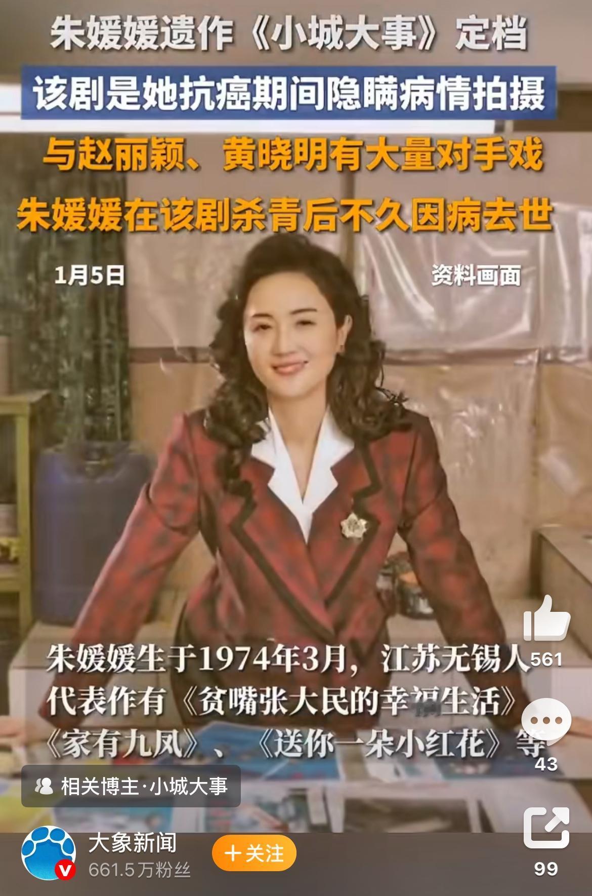 朱媛媛留给观众的最后一部作品, 有太多不舍和感动, 因为她是用尽最后的力气,强装着微笑演完的这部剧。 朱媛媛哪里都好,唯一不好的地方就是太低调了,就算是生病抗癌5年,身体已经严重透支了,特别疼特别难受的时候,也从来没有给剧组透露过一句话。 《小城大事》杀青16天她就离开了,和她合作的演员都很震惊,在片场朱媛媛一直笑着对每个人说话,心情也很好,一点也看不出来是生病的样子。 这就是她厉害的地方,从来不卖惨,用专业的态度去对待工作,这种敬业精神真的太值得点赞了。