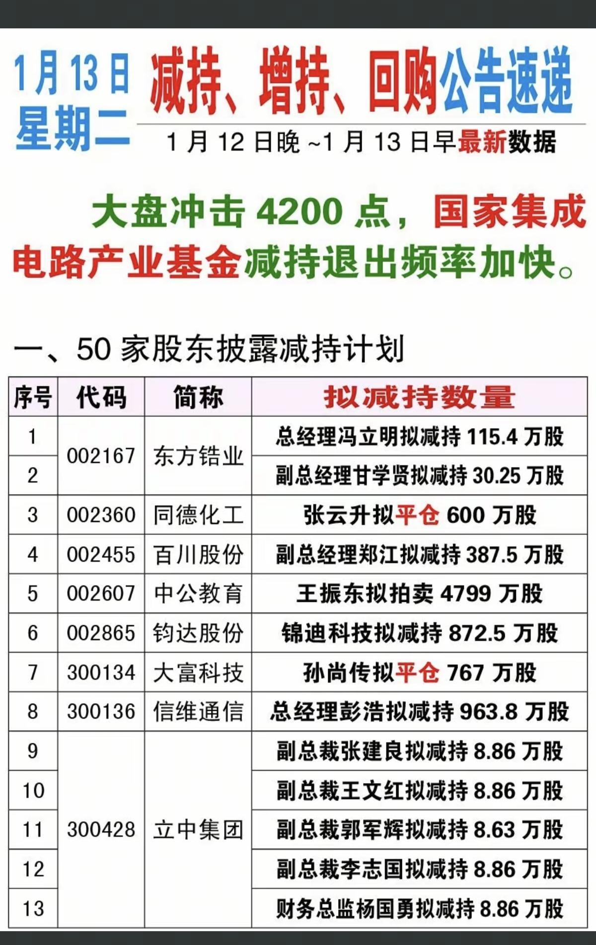 1.13周二 最新:减持、增持、回购公告 大盘冲击4200,国家大基金退出加快! 50家股东披露减持计划,2家国家大基金计划减持,3家公司股东增持计划,8家公司法拍股份,7家公司回购计划