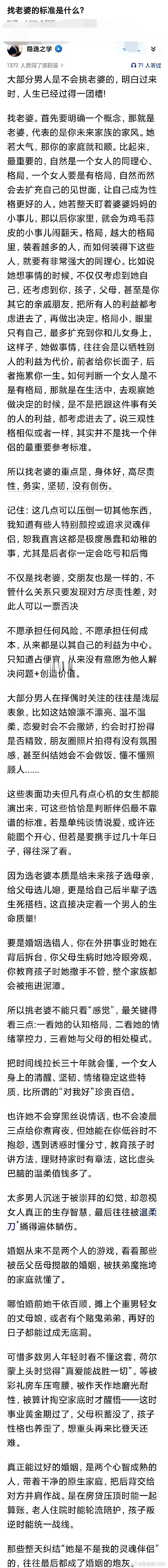找老婆的标准是什么?关键你得有得挑啊,许多人连挑的资格都没有。这帖子,写得一点都不接地气。